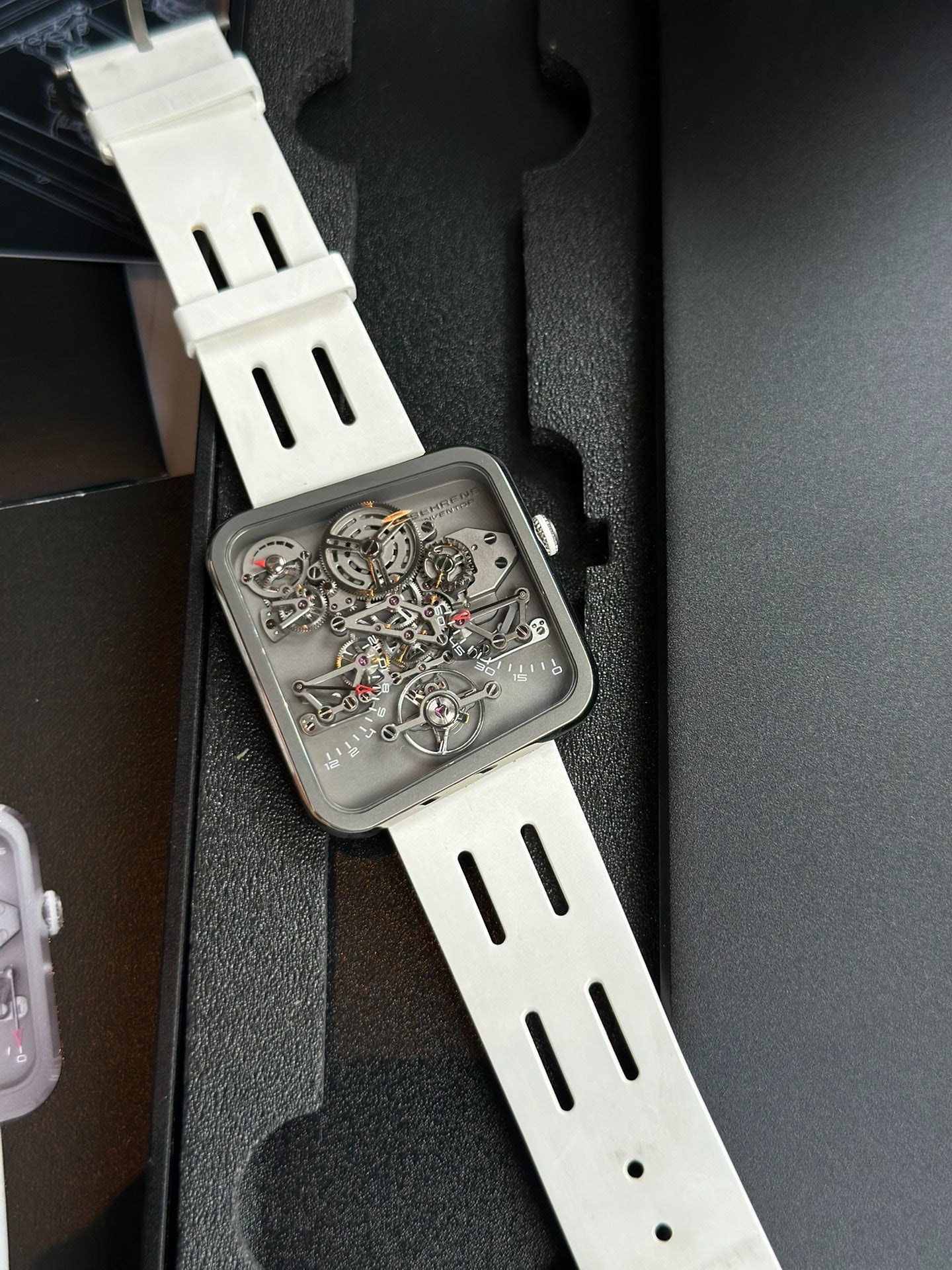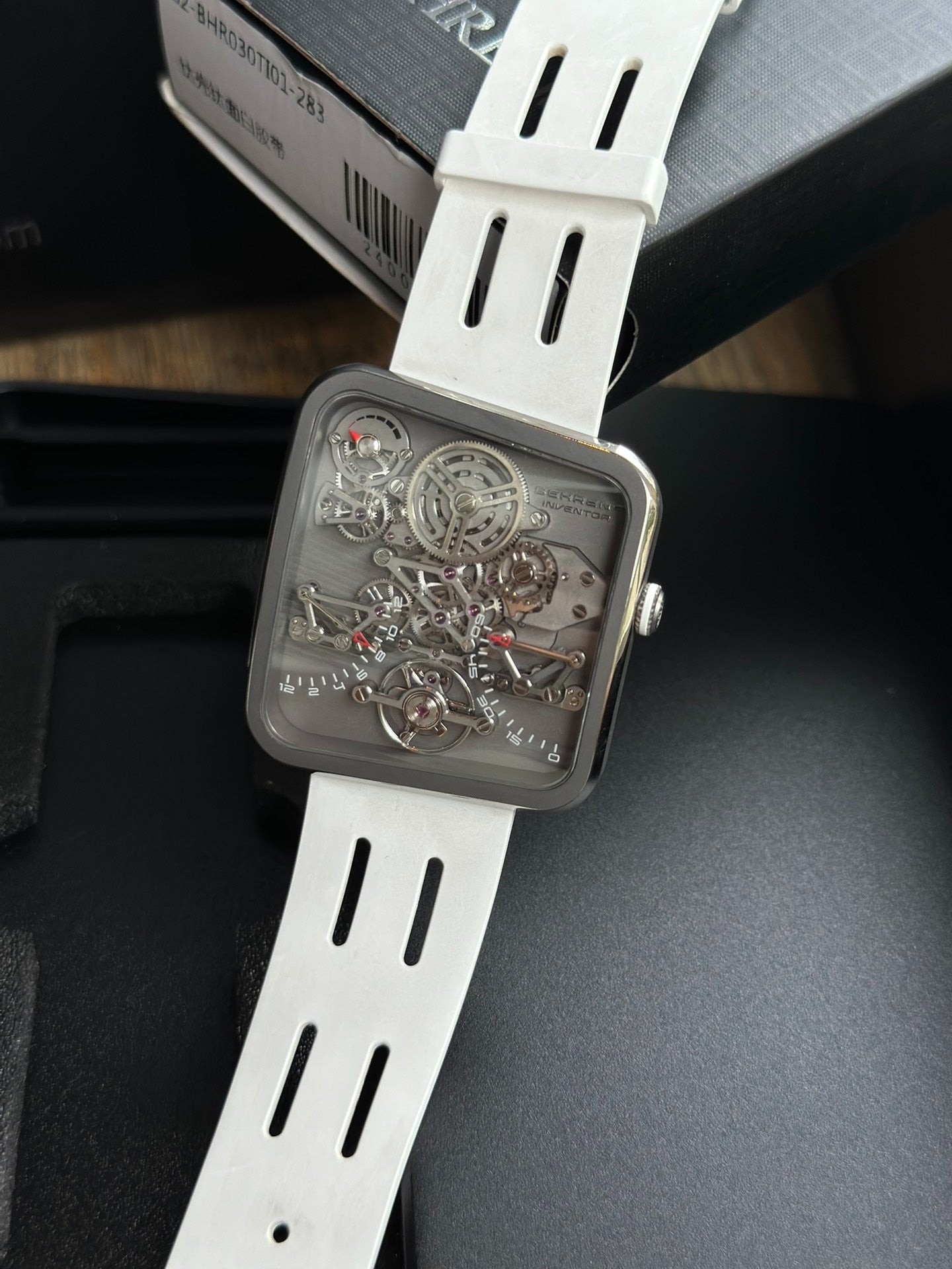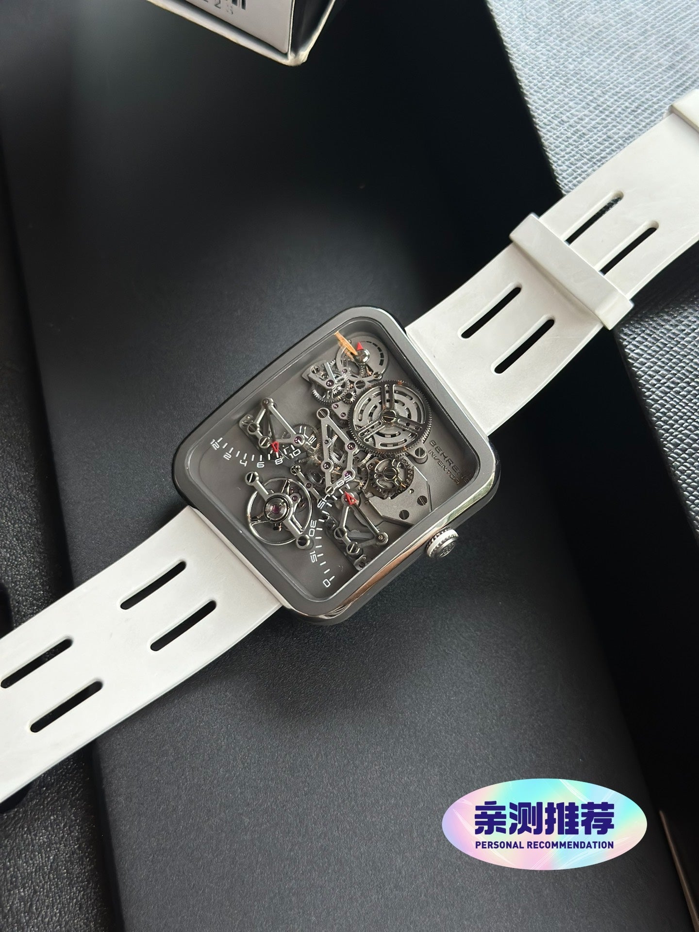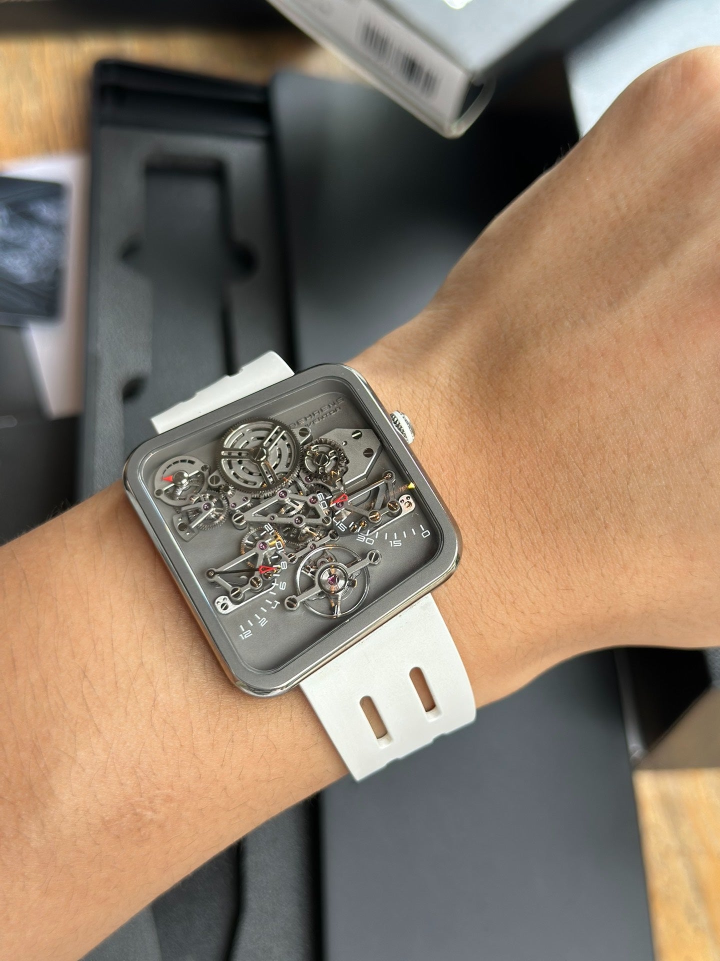 贝伦斯惊鸿之笏 BHR030,白色表带搭配银色表壳,双逆跳时分显示,动力储存显示。表径42.6mm*38.2mm,厚度5.3mm,总重20g,贝伦斯自研BM02机芯,38小时动储,240多个零件组成