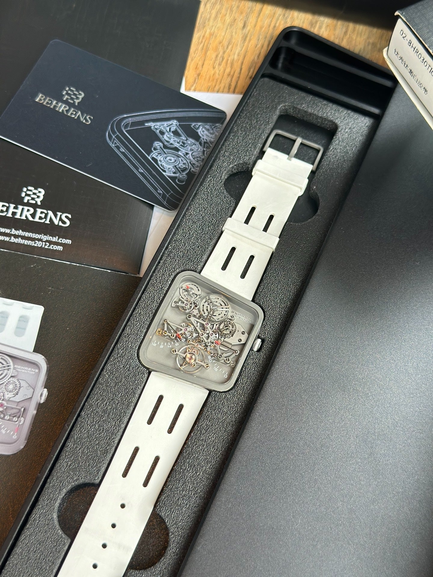 Case dimensions: 42.6mm × 38.2mm, thickness 5.3mm, total weight 20g. Equipped with Behrens in-house BM02 movement, 38-hour power reserve, composed of over 240 components.