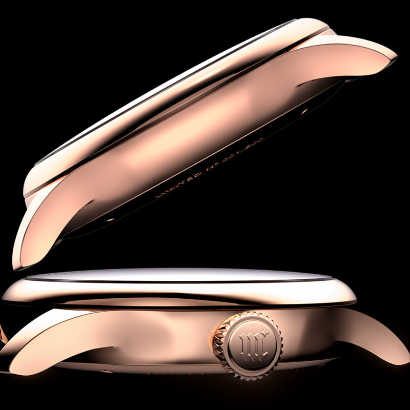 316L stainless steel. Plated in rose gold color. Mirror-polished. Diameter: 37 mm. Thickness: 10.15 mm. Lug width: 19 mm. Water resistance: 5 ATM. Luminescence: No lume. Crystal: Sapphire crystal. Double domed. Has anti-reflective coating. Front crystal with double AR coating — applied on both top and underside. Case back: Fixed with screws. Transparent. Sapphire crystal case back. Crown: Push-pull. Stainless steel crown. Signed with the Vager Hauers watch graphic logo (new logo since 2025).