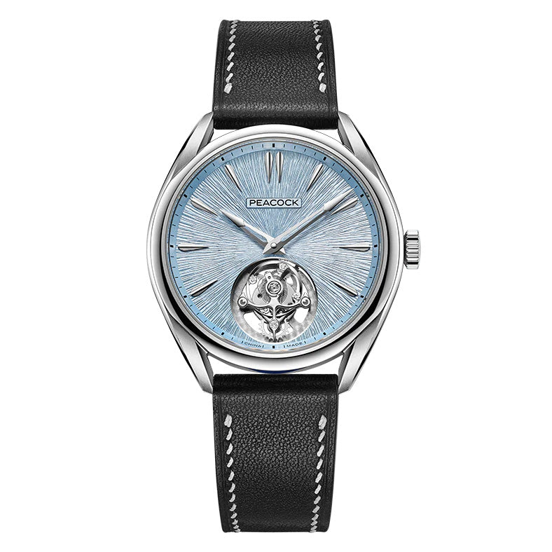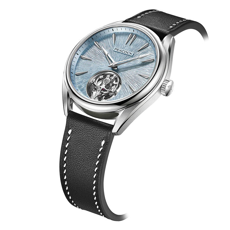 904L stainless steel. Diameter: 39.5 mm. Thickness: 8.9 mm. Water resistance: 5 ATM. Luminescence: No lume. Dial: Light blue. Hand-chased dial texture. Applied hour markers. Crystal: Sapphire crystal. Flat. Has anti-reflective coating. Case back: Fixed with screws. Transparent. Crown: Push-pull. Fluted cylinder shape. Stainless steel crown. Signed with the Peacock watch logo.