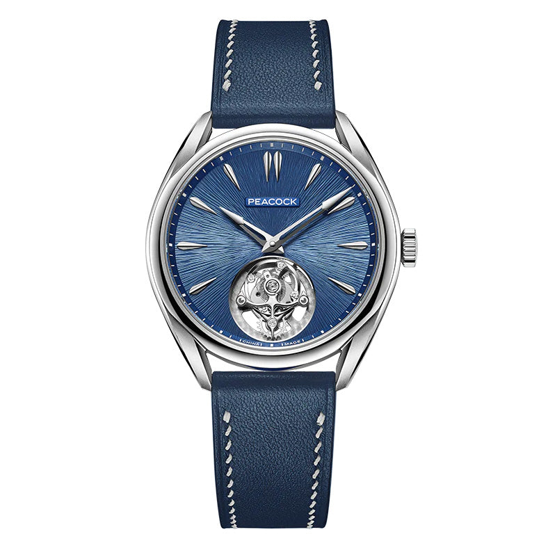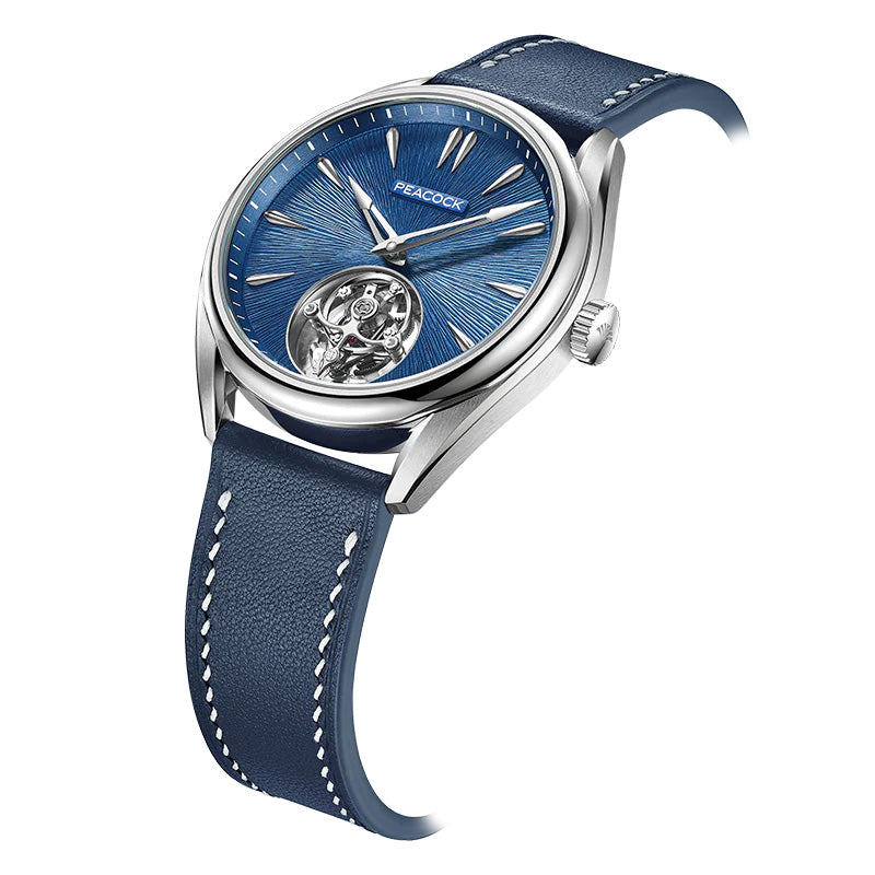 904L stainless steel. Diameter: 39.5 mm. Thickness: 8.9 mm. Water resistance: 5 ATM. Luminescence: No lume. Dial: Deep blue. Hand-chased dial texture. Applied hour markers. Crystal: Sapphire crystal. Flat. Has anti-reflective coating. Case back: Fixed with screws. Transparent. Crown: Push-pull. Fluted cylinder shape. Stainless steel crown. Signed with the Peacock watch logo.