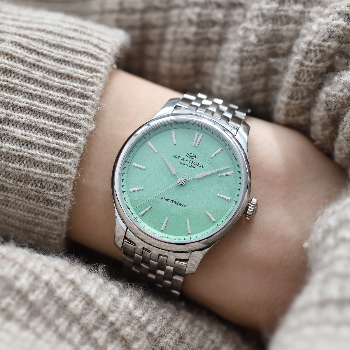 316L Stainless Steel. Diameter: 41 mm. Thickness: 9.8 mm. Water resistance: 5 ATM. Weight: 130 grams (the whole watch including strap). Luminescence: No lume. Dial: Green. Frost pattern. Applied hour markers. Crystal: Sapphire Crystal. Case back: Fixed With Screws. Transparent. Sapphire Crystal case back. Crown:Push-Pull. Fluted Cylinder shape. Stainless Steel crown. Signed with the Sea-Gull watch logo.