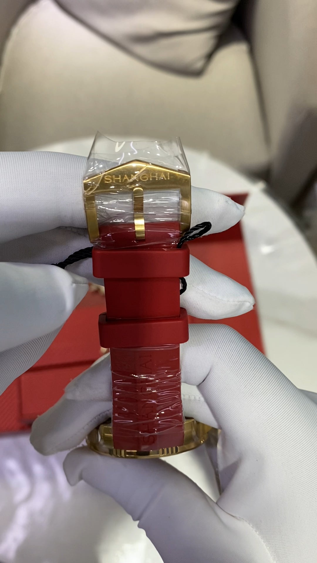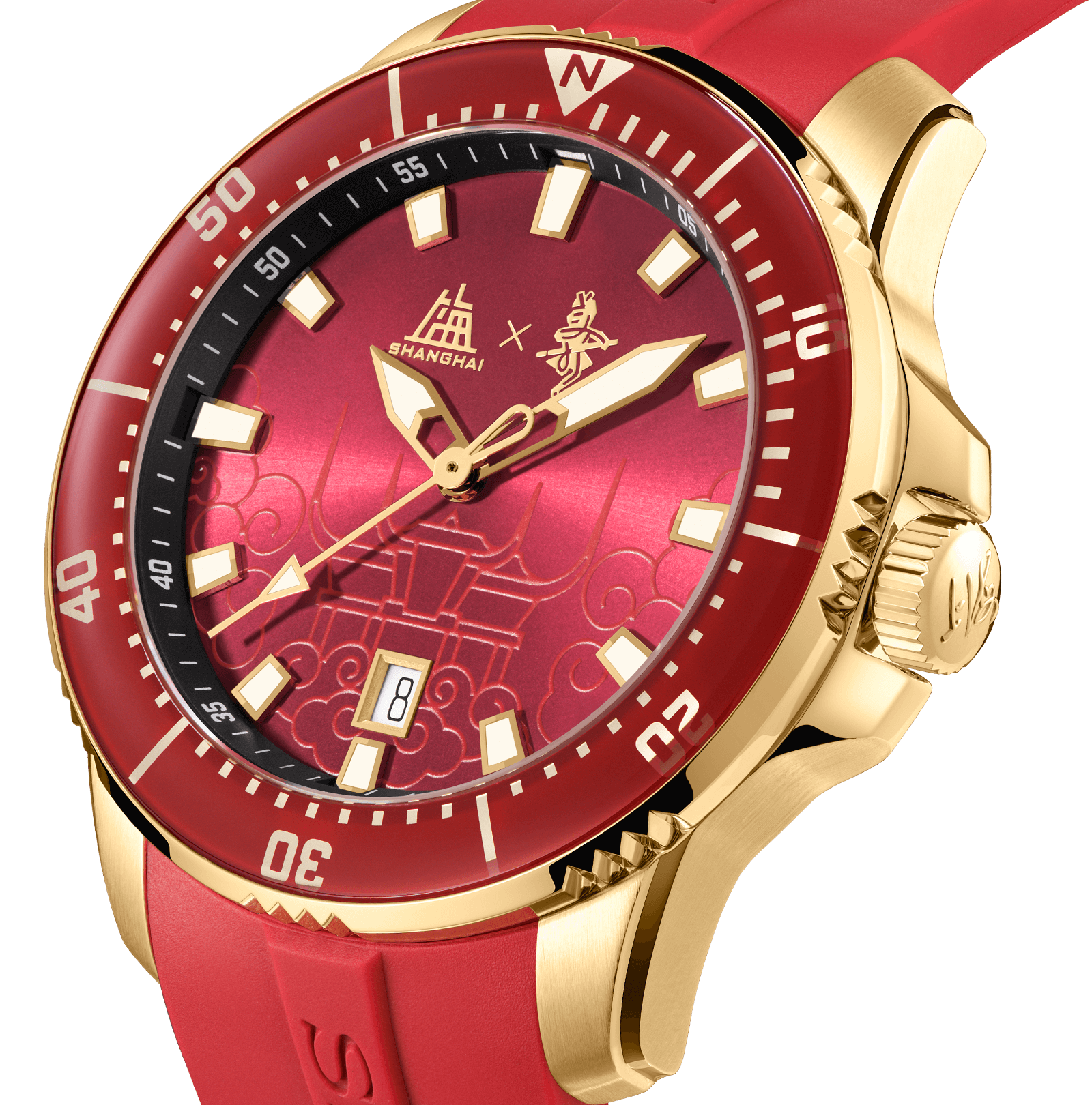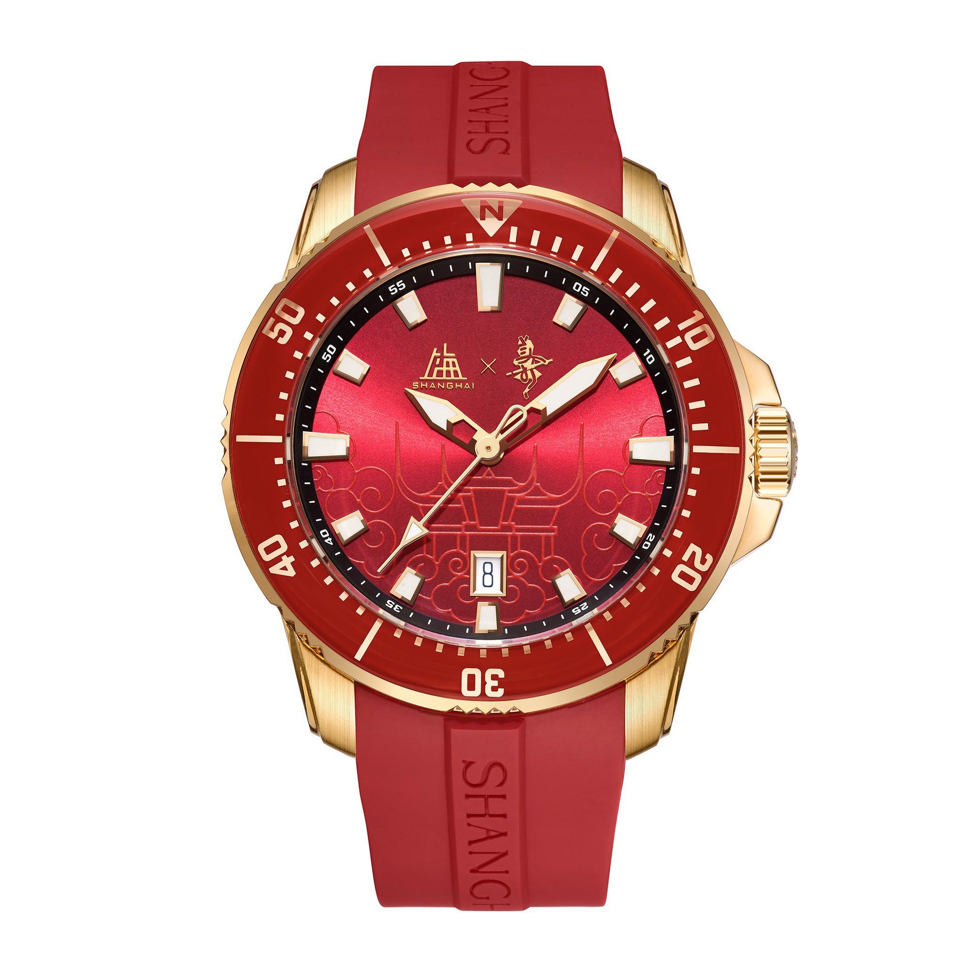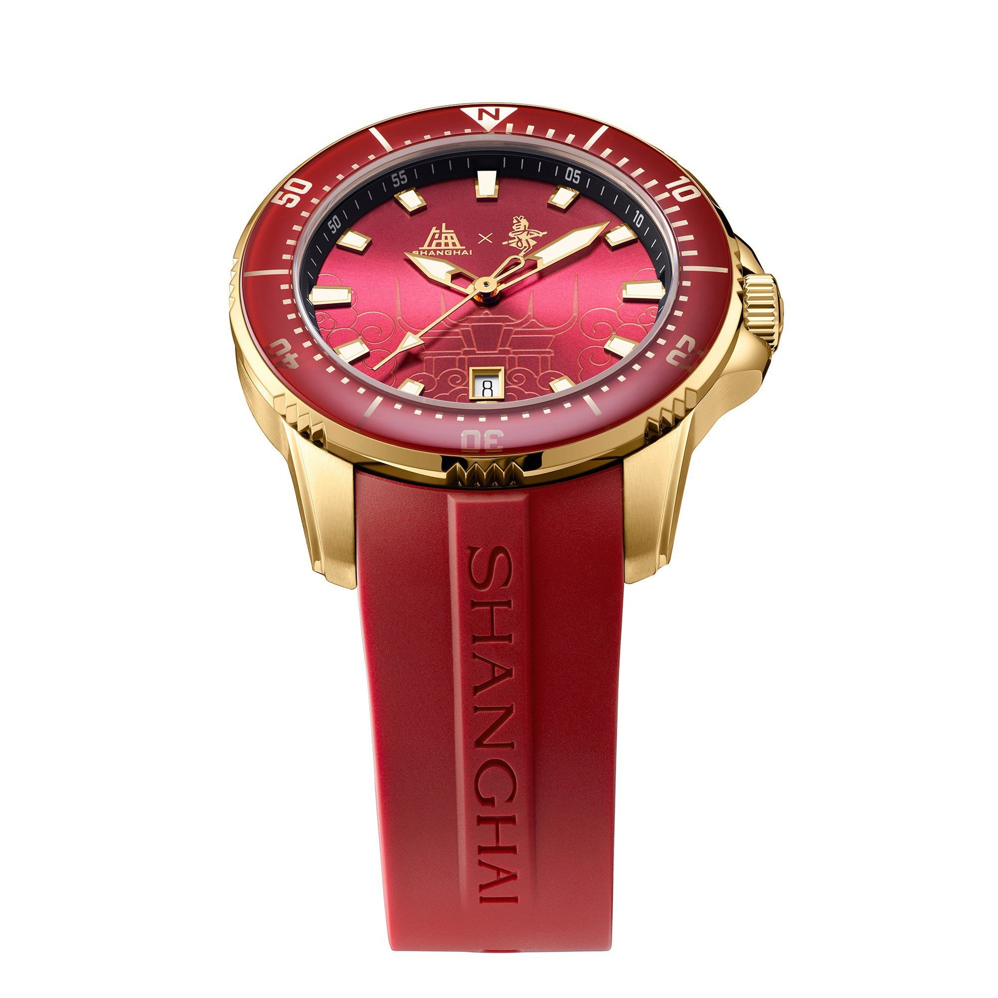 316L stainless steel. Diameter: 43.6 mm. Thickness: 13 mm. Lug width: 22 mm. Water resistance: 30 ATM. Luminescence: Super-LumiNova green luminescence on hands and indices. Bezel: Red. Chronograph bezel. Anti-clockwise rotatable. Sapphire crystal bezel insert. Dial: Red. Sunburst finish. Patterns of auspicious clouds and the Lingxiao Palace. Applied hour markers. Crystal: Sapphire crystal. Case back: Screw-down notched. Not transparent. 316L stainless steel case back. Crown: Screw-down. Fluted cylinder shape. Signed with the "上海" logo.