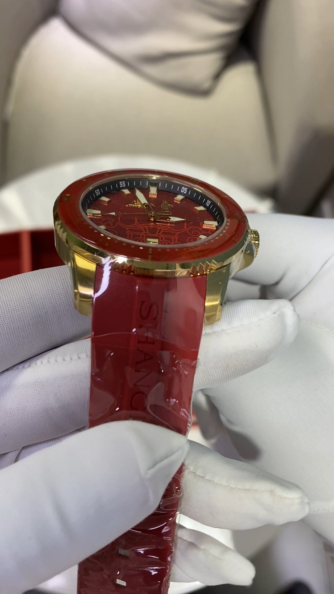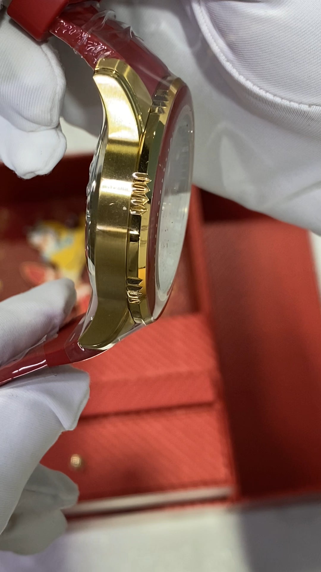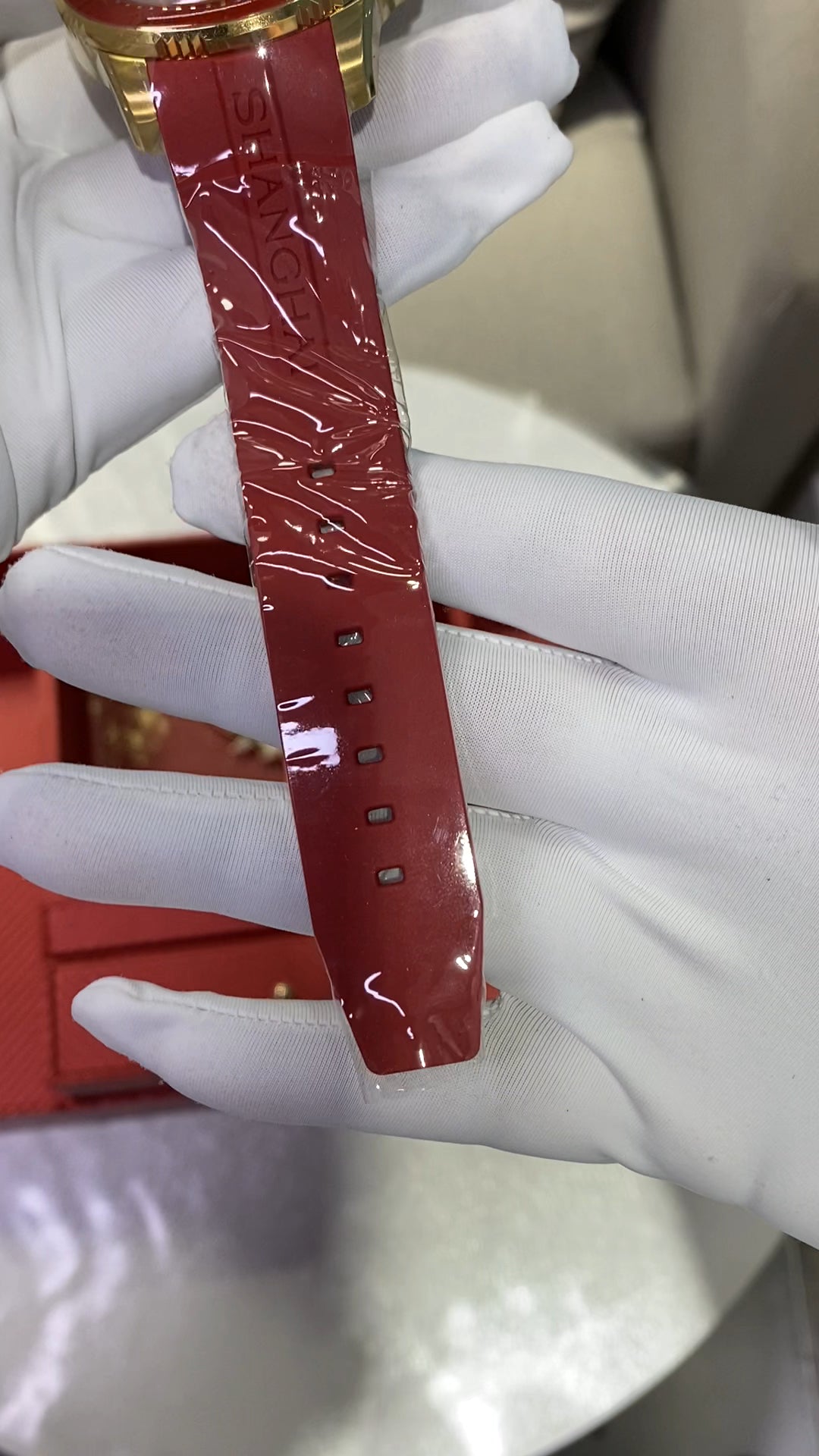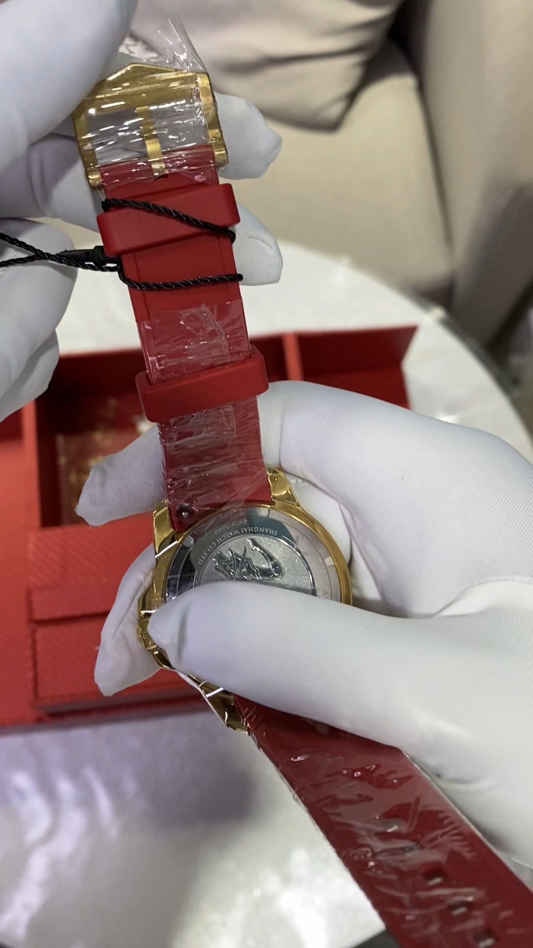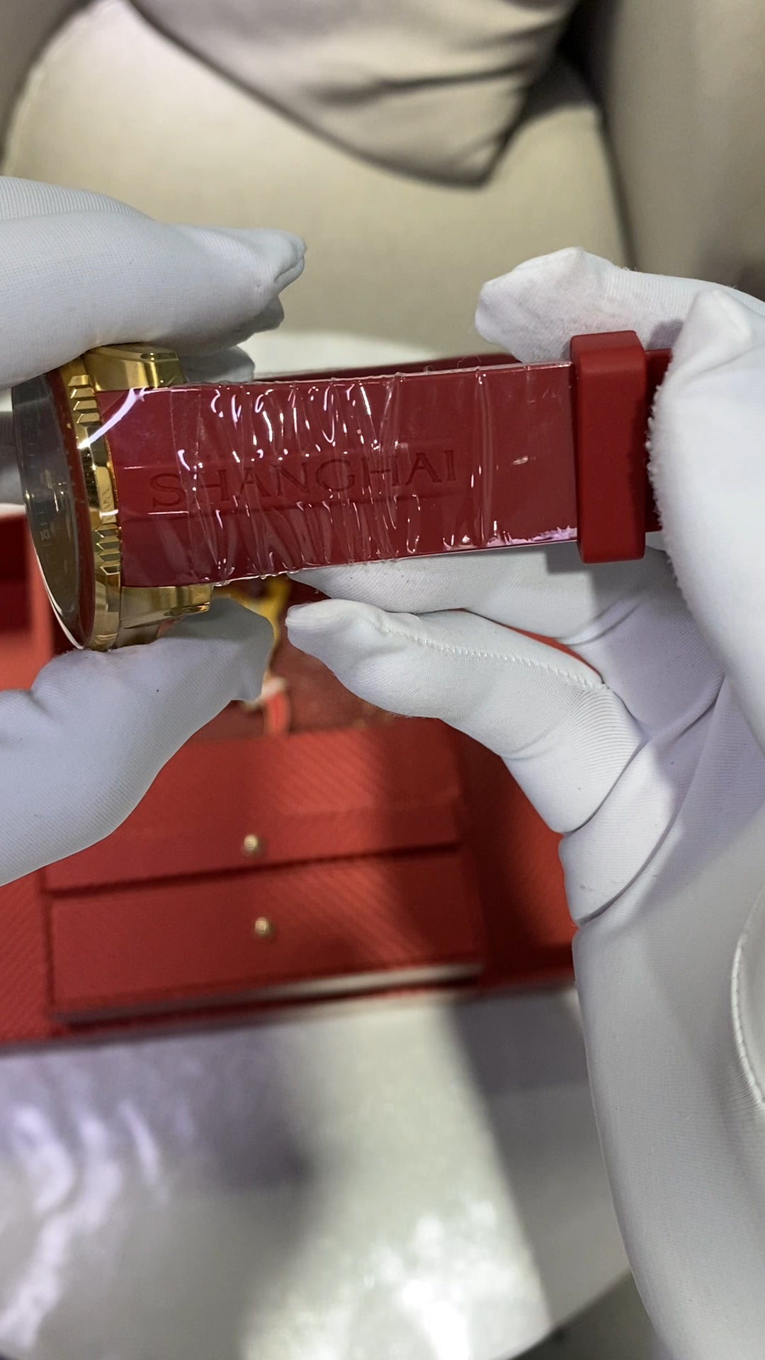 316L stainless steel. Diameter: 43.6 mm. Thickness: 13 mm. Lug width: 22 mm. Water resistance: 30 ATM. Luminescence: Super-LumiNova green luminescence on hands and indices. Bezel: Red. Chronograph bezel. Anti-clockwise rotatable. Sapphire crystal bezel insert. Dial: Red. Sunburst finish. Patterns of auspicious clouds and the Lingxiao Palace. Applied hour markers. Crystal: Sapphire crystal. Case back: Screw-down notched. Not transparent. 316L stainless steel case back. Crown: Screw-down. Fluted cylinder shape. Signed with the "上海" logo.