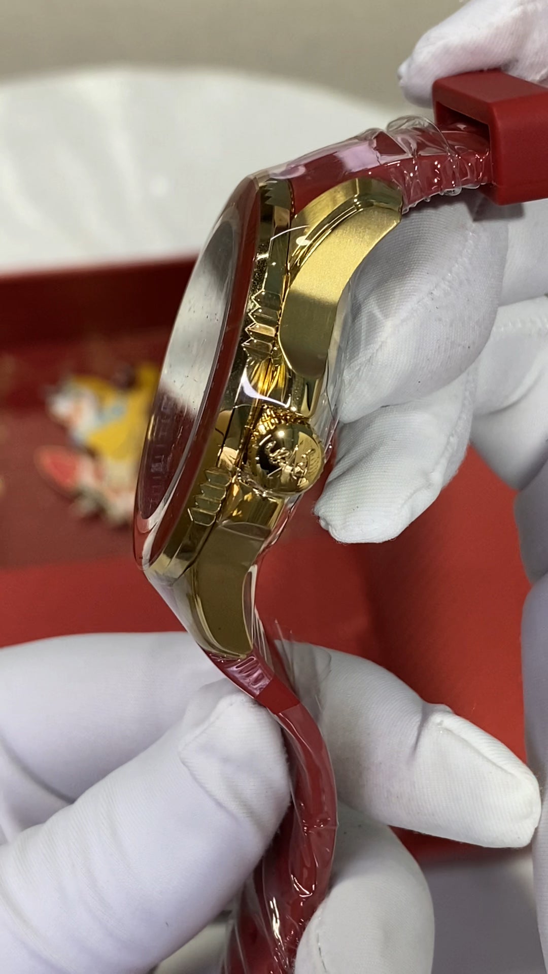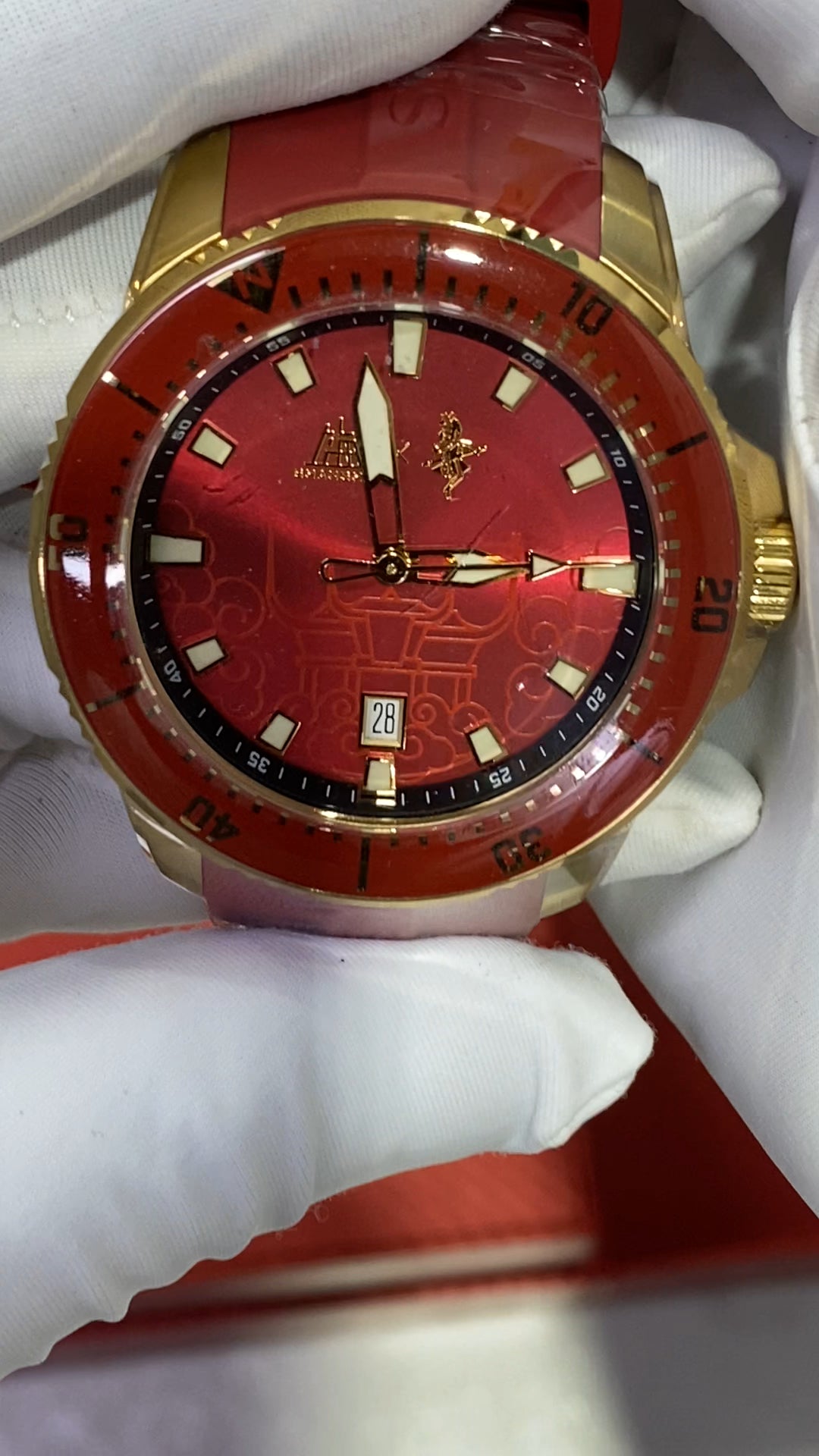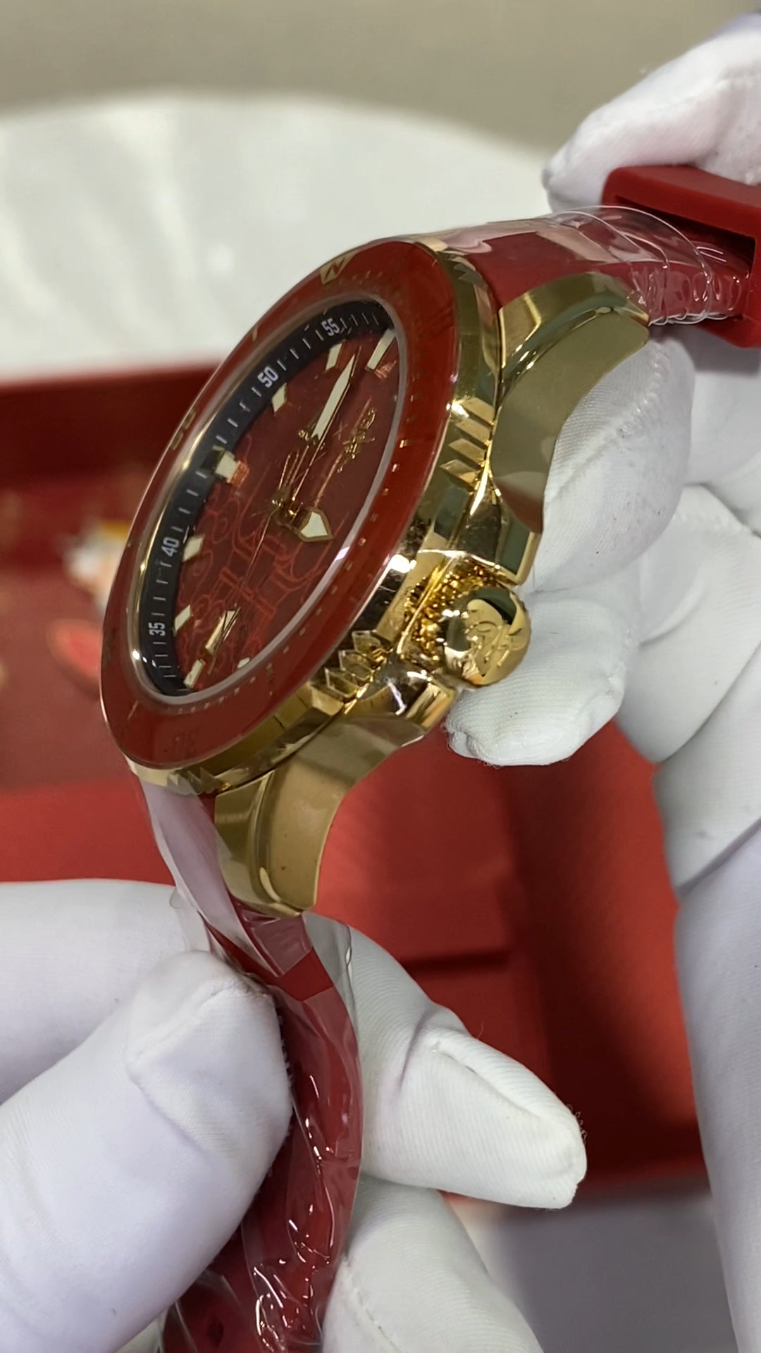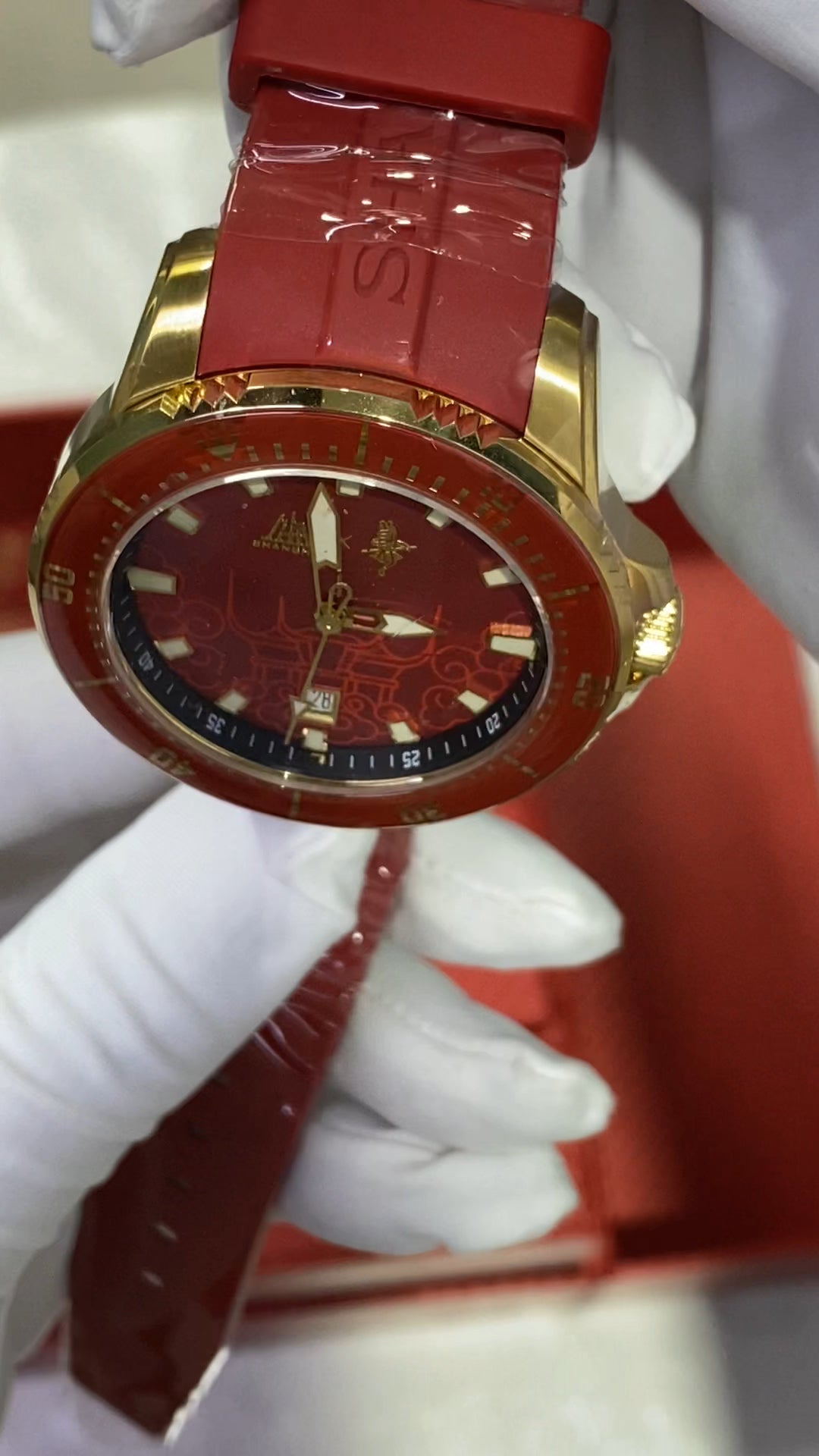 316L stainless steel. Diameter: 43.6 mm. Thickness: 13 mm. Lug width: 22 mm. Water resistance: 30 ATM. Luminescence: Super-LumiNova green luminescence on hands and indices. Bezel: Red. Chronograph bezel. Anti-clockwise rotatable. Sapphire crystal bezel insert. Dial: Red. Sunburst finish. Patterns of auspicious clouds and the Lingxiao Palace. Applied hour markers. Crystal: Sapphire crystal. Case back: Screw-down notched. Not transparent. 316L stainless steel case back. Crown: Screw-down. Fluted cylinder shape. Signed with the "上海" logo.