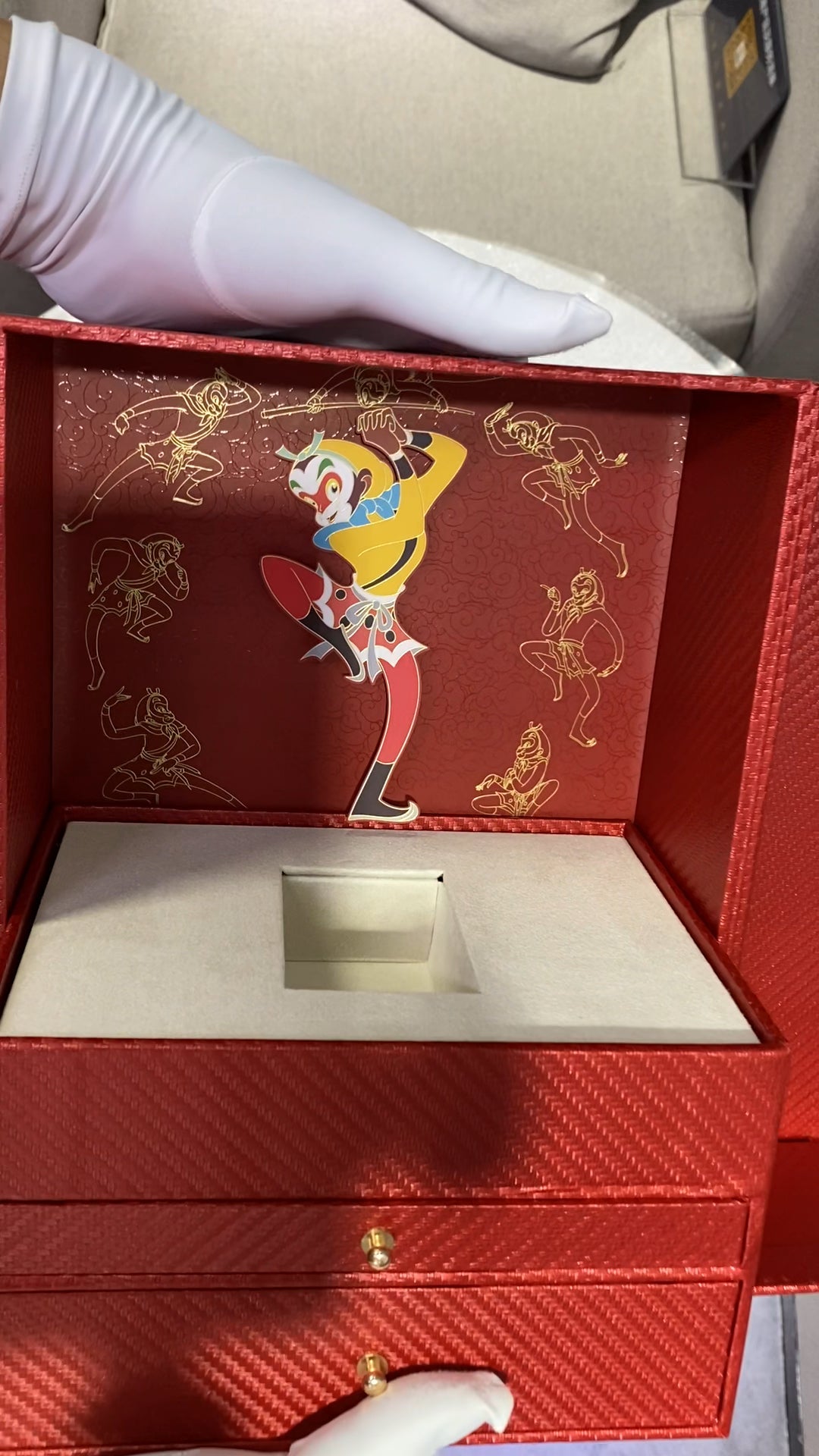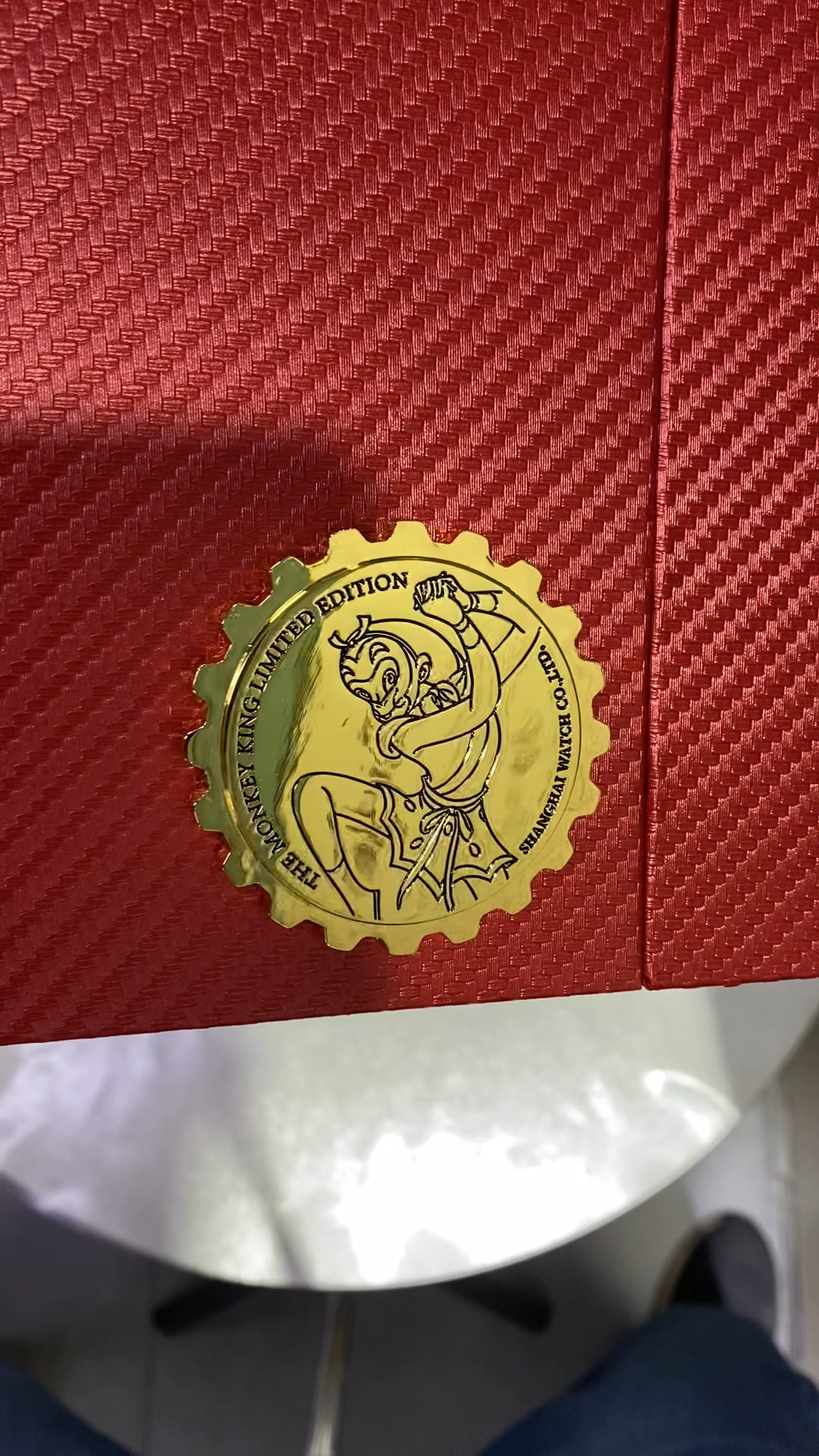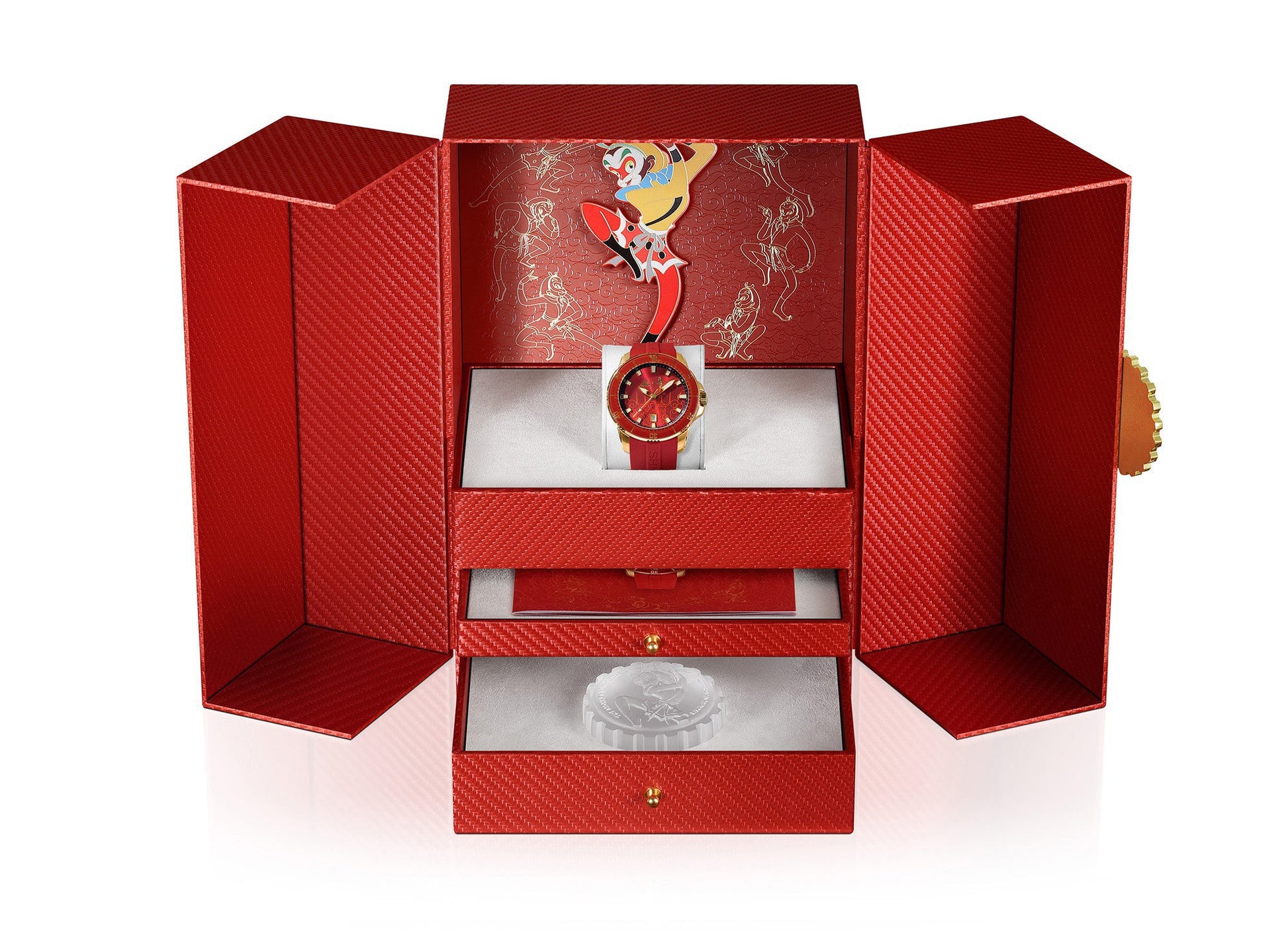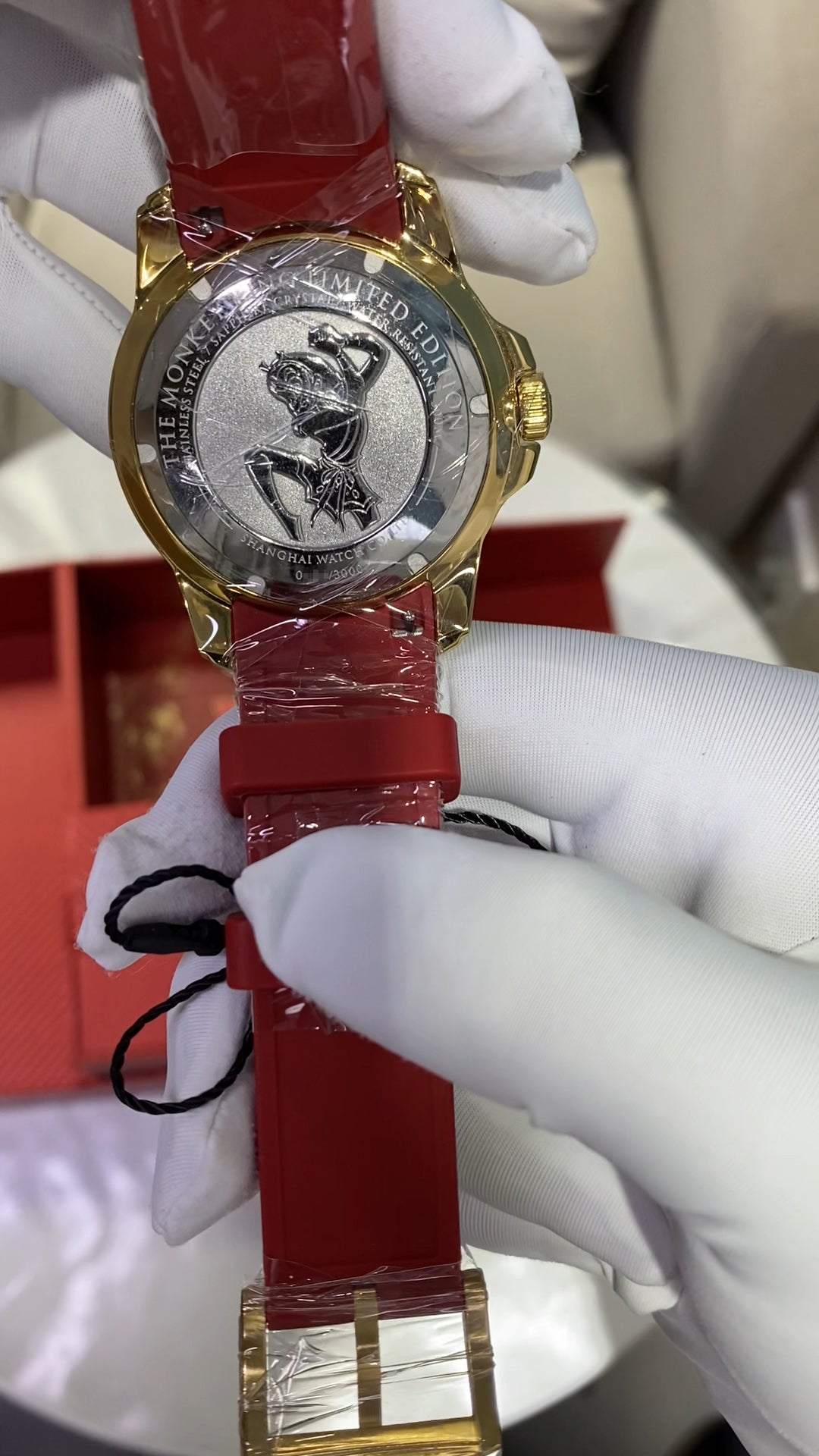 Shanghai Watch has worked with the Shanghai Animation Film Studio to present this timepiece. The watch features the traditional building-shaped Shanghai Watch logo and the Monkey King logo of the Shanghai Animation Film Studio at 12 o'clock, and outline of the auspicious clouds and the Lingxiao Palace are visible on the dial. On the case back engraves the figure of the Monkey King.