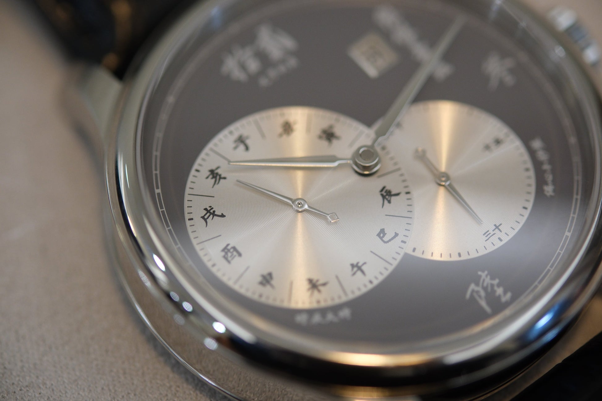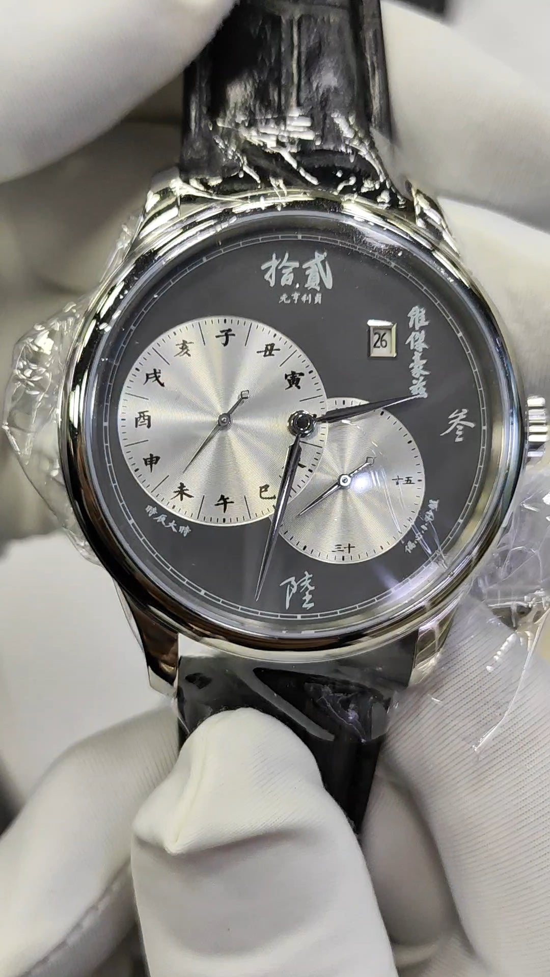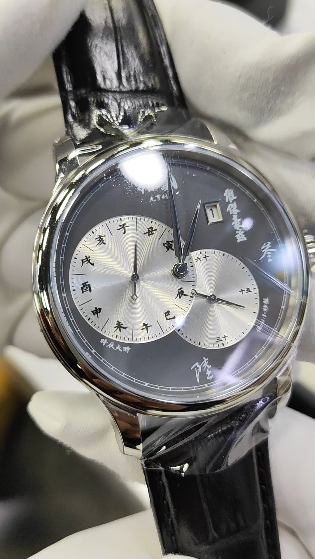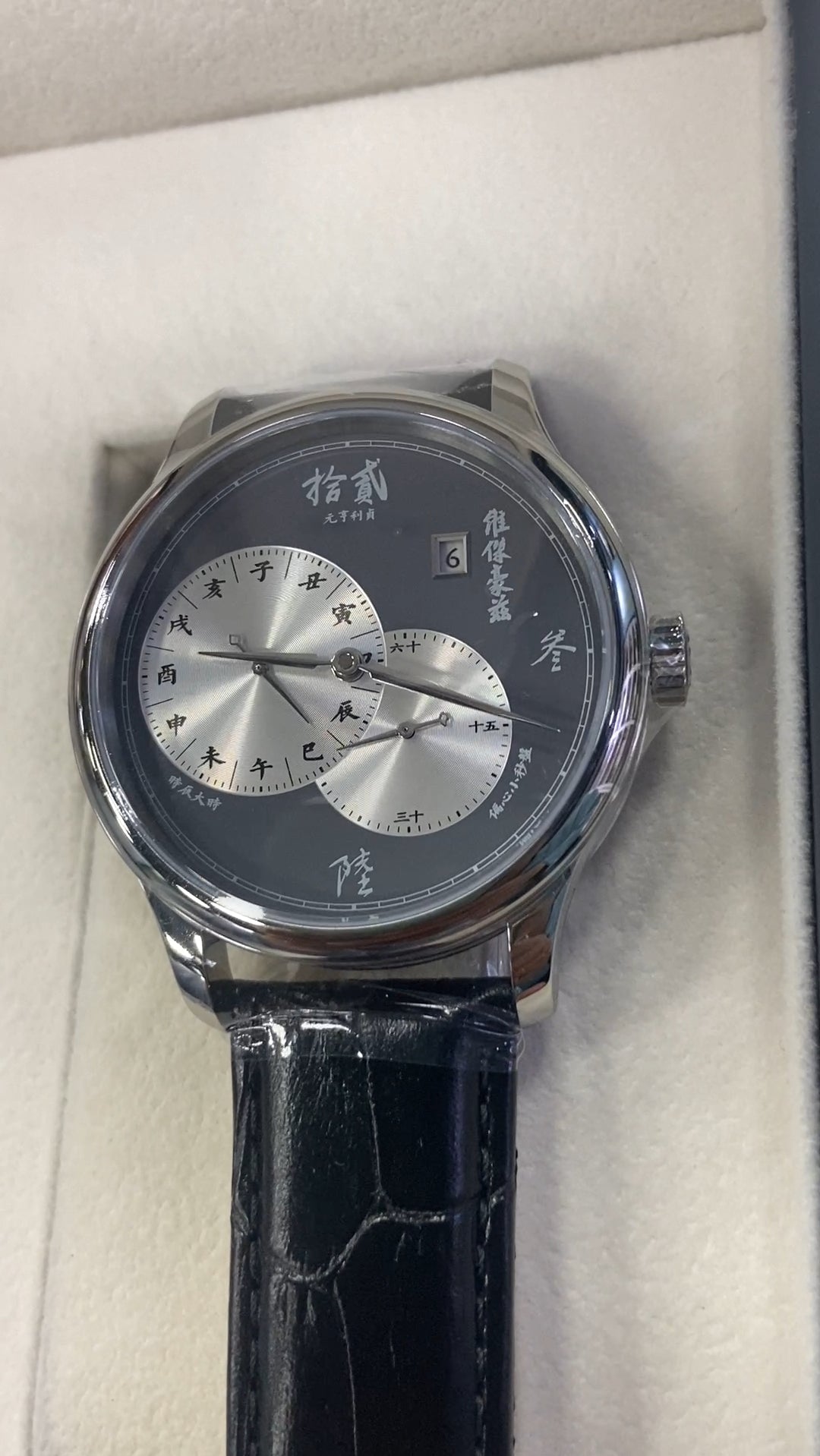 Vager Hauers patented design. The 24 hour sub-dial at 9 o'clock indicates the traditional Chinese double hours. Small seconds hand at 5 o'clock, date aperture and the brand name in Chinese between 1 and 2 o'clock.