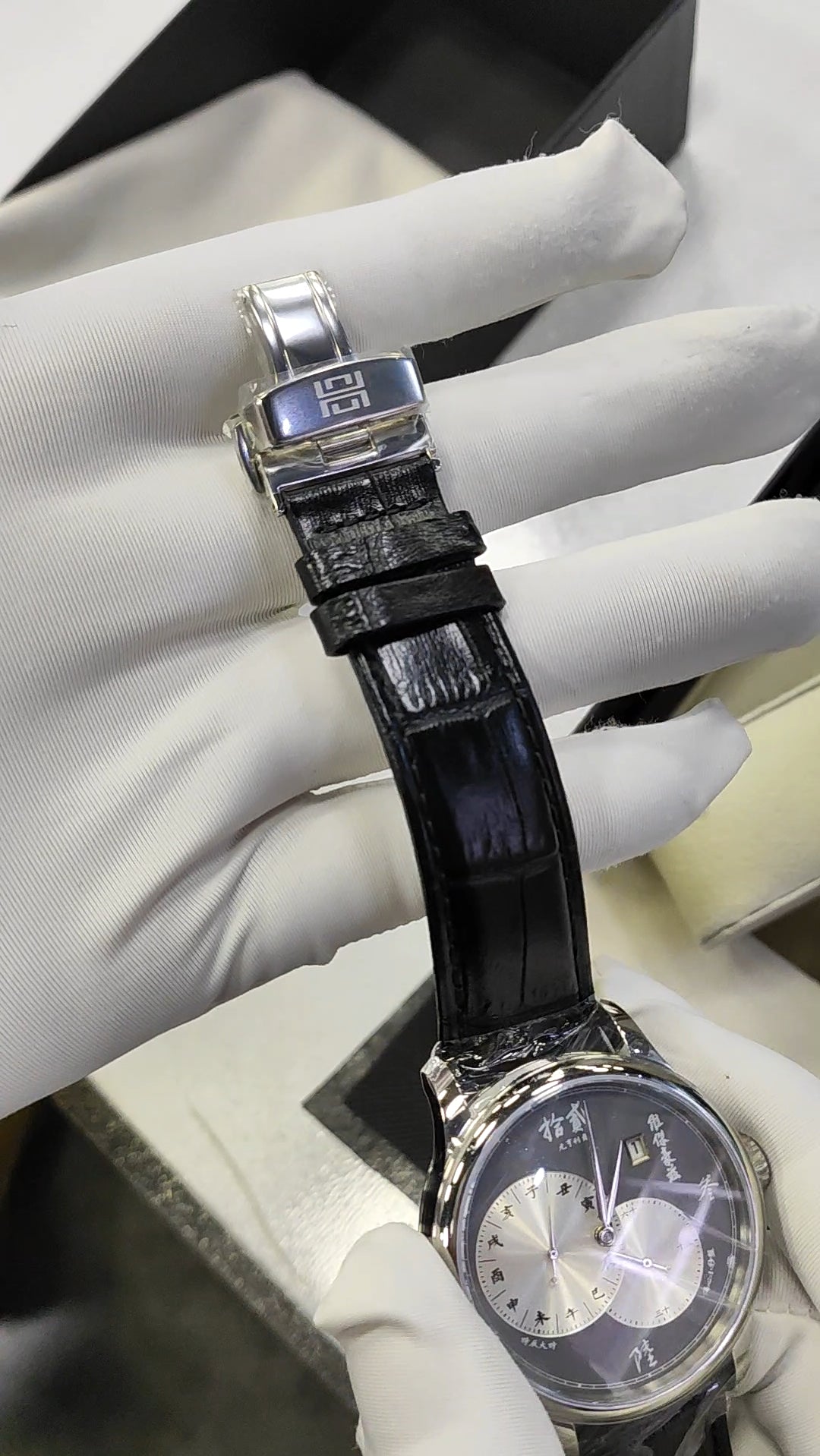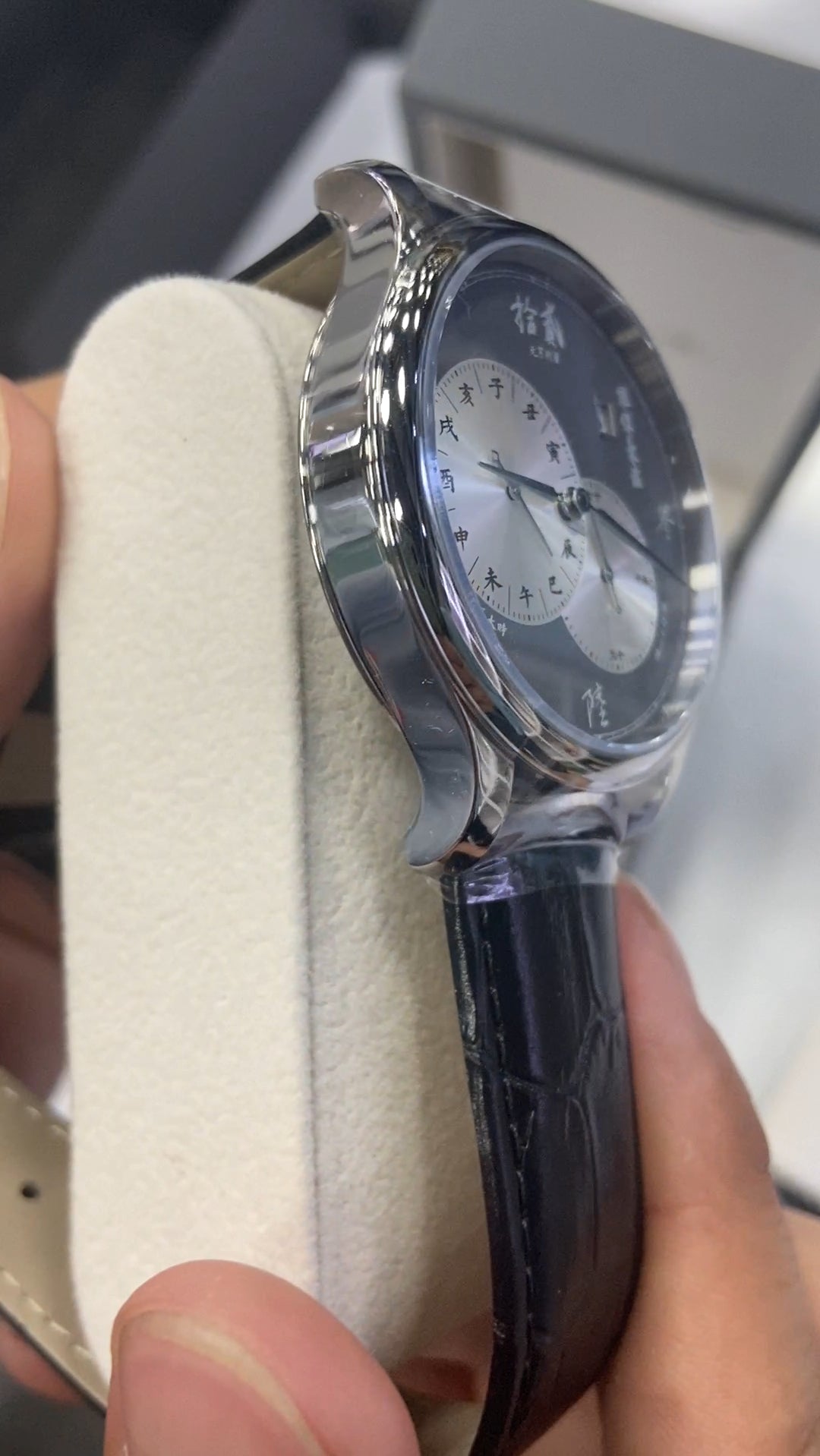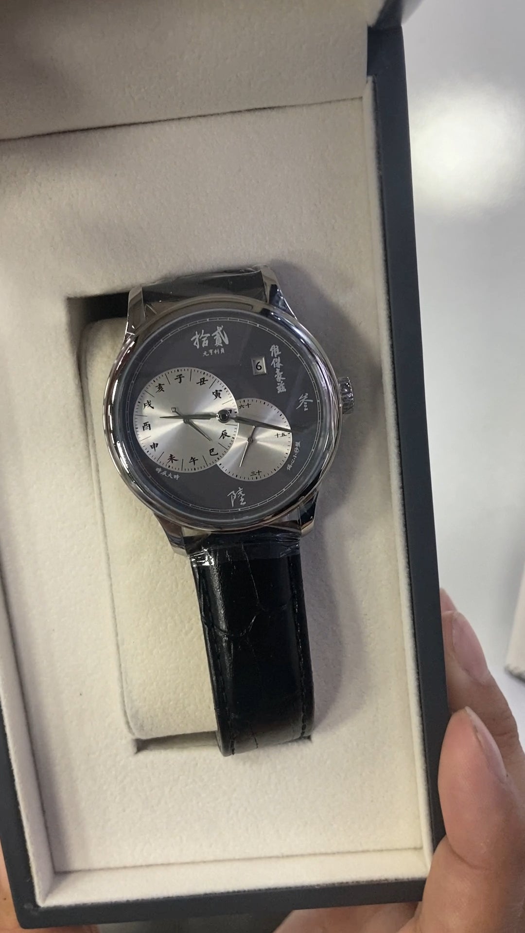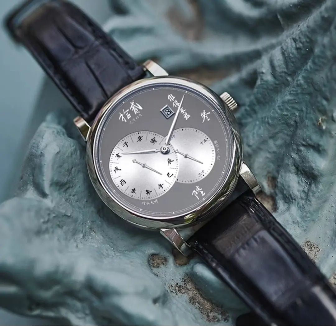 Vager Hauers patented design. The 24 hour sub-dial at 9 o'clock indicates the traditional Chinese double hours. Small seconds hand at 5 o'clock, date aperture and the brand name in Chinese between 1 and 2 o'clock.