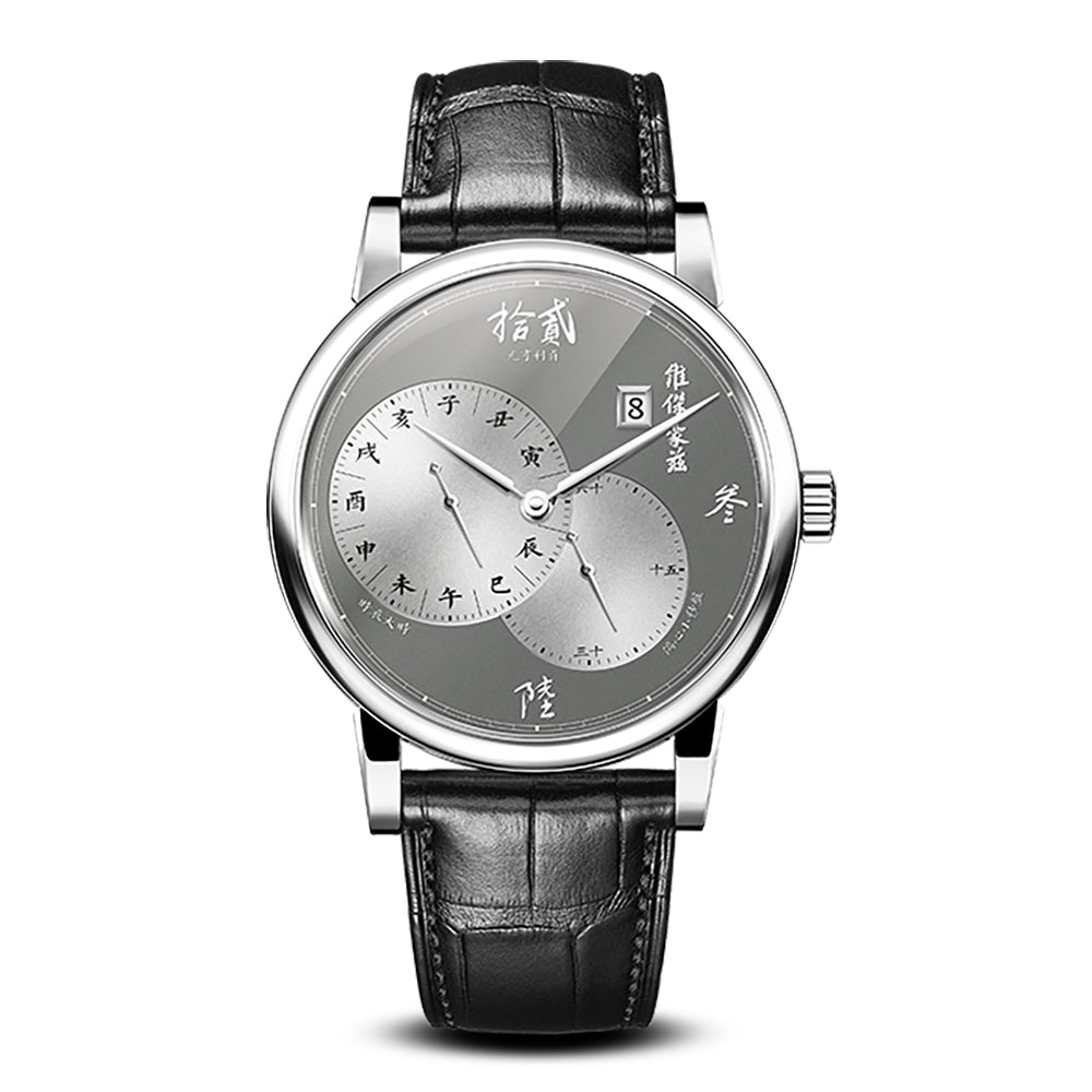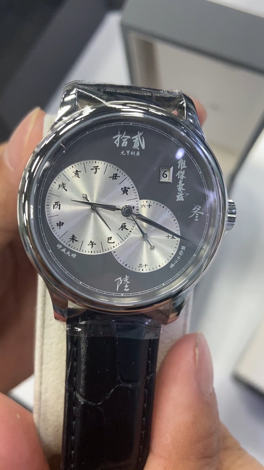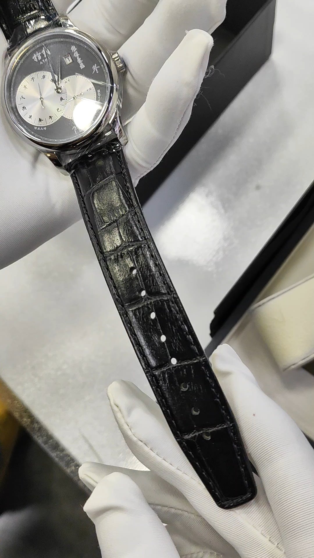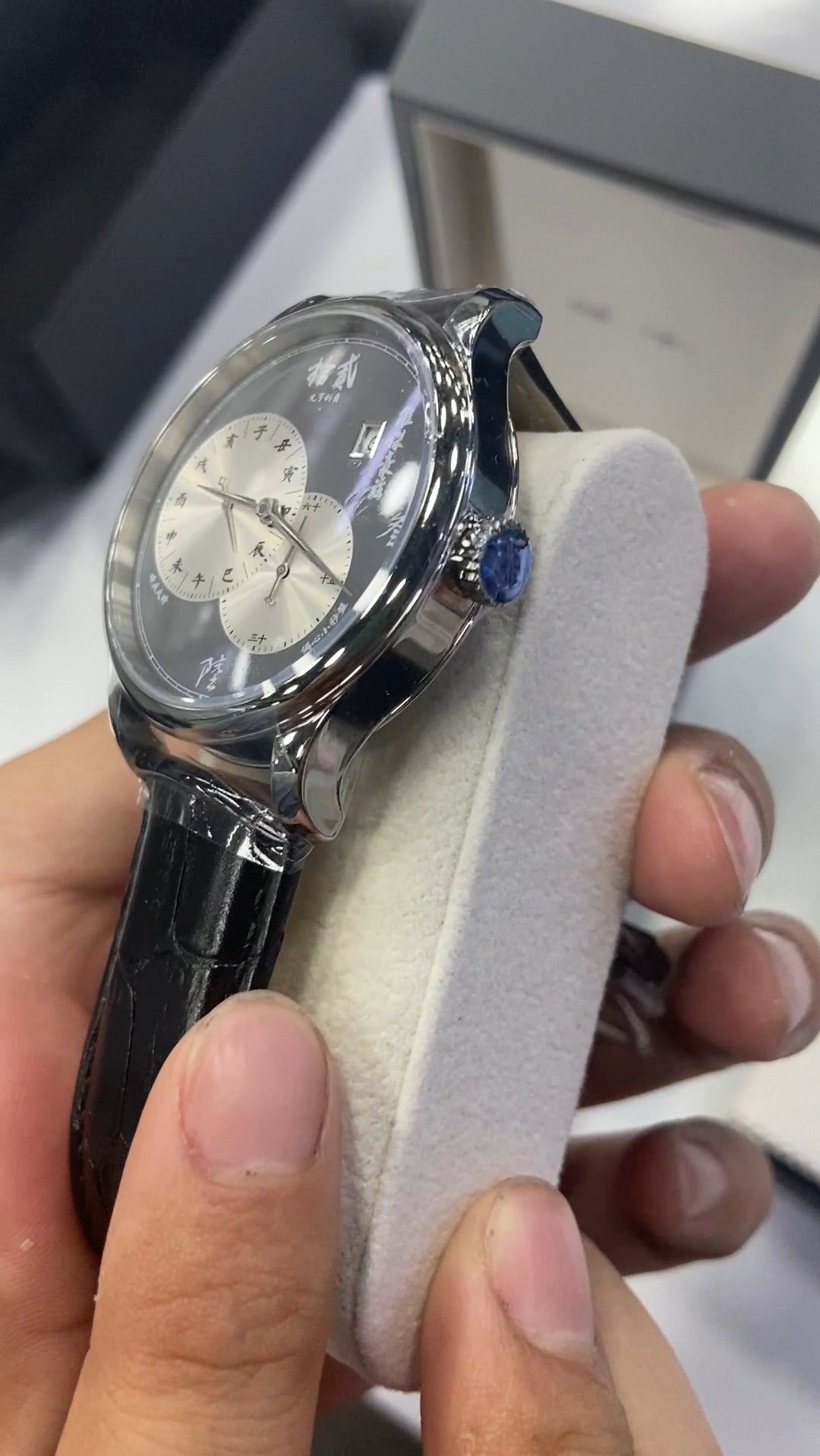 Vager Hauers patented design. The 24 hour sub-dial at 9 o'clock indicates the traditional Chinese double hours. Small seconds hand at 5 o'clock, date aperture and the brand name in Chinese between 1 and 2 o'clock.