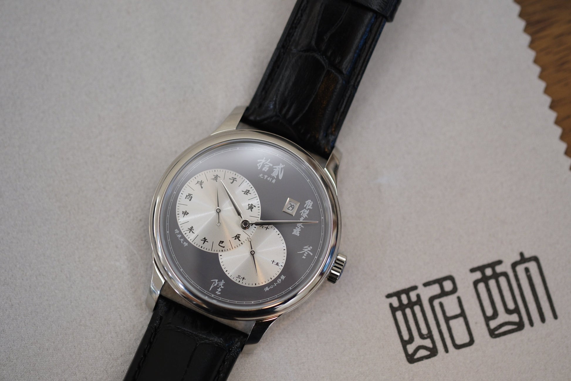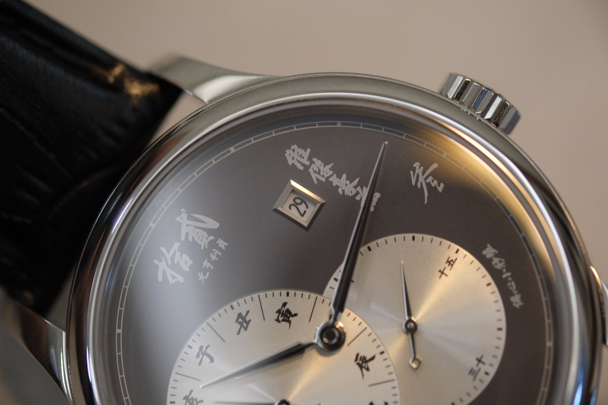 Silver color case; Grey dial back ground, silver color subdials; "偏心小秒盤" at 4 o'clock