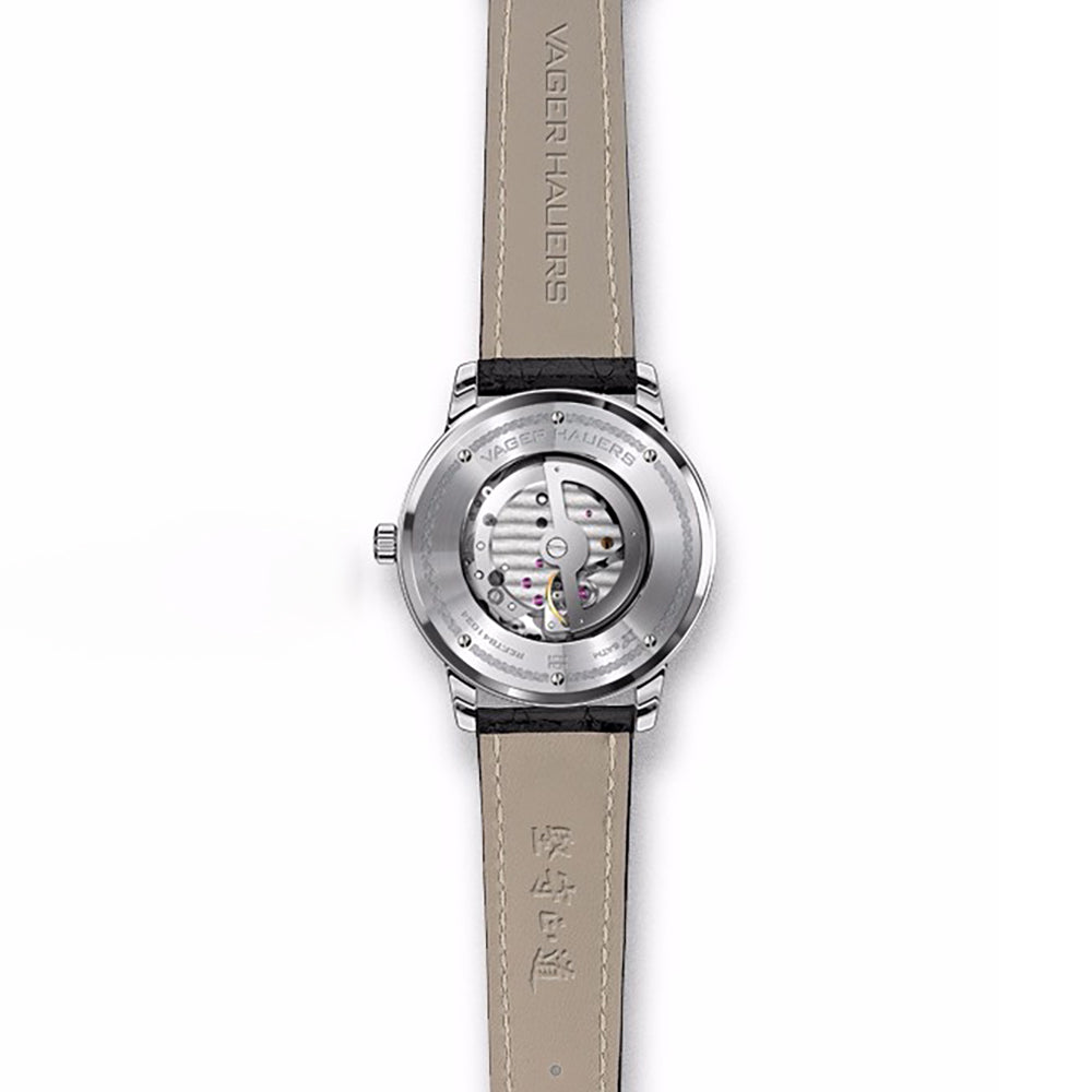 316L stainless steel. Diameter: 40 mm. Thickness: 11.2 mm. Lug width: 20 mm. Water resistance: 5 ATM. Luminescence: No lume. Dial: Grey. Indented subdials. Capitalized Chinese numerals at 3, 6, 12. Chinese brand name at 2 o'clock. The 24-hour sub-dial at 9 o'clock is marked with traditional Chinese big hours or Shichen (Shí Chén 时辰). Crystal: Sapphire crystal. Single domed. Case back: Fixed with screws. Transparent. Sapphire crystal case back. Hands: Han dynasty sword hour and minute hands. Crown: Push-pull. Fluted cylinder shape. 316L stainless steel crown. Signed with the Vager Hauers watch graphic logo.