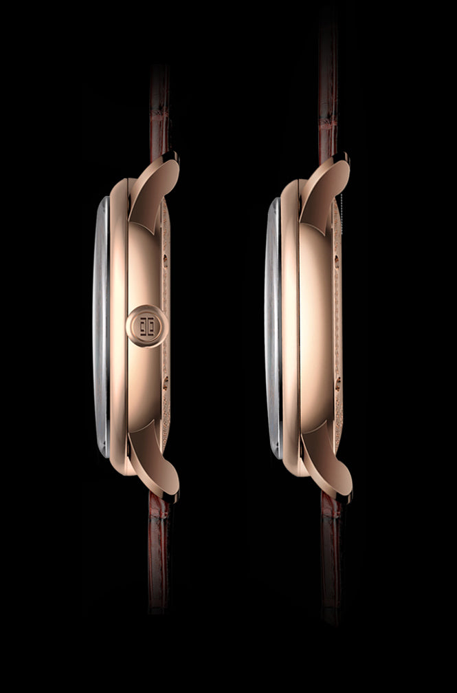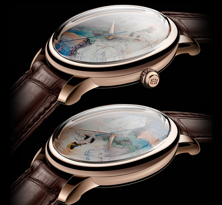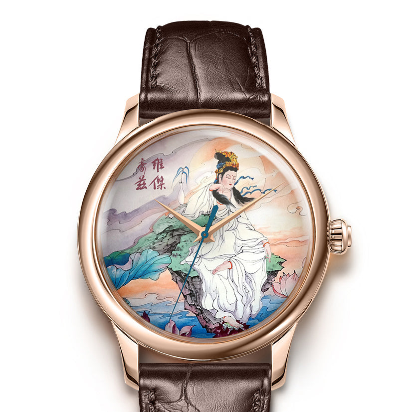 316L stainless steel. PVD coated with material containing 18K gold. Diameter: 40.5 mm. Thickness: 9.8 mm. Lug width: 20 mm. Water resistance: 50 meters. Luminescence: Green lume on Guanyin and her magical instrument: the Jade Clean Jar and willow branch. Dial: Painted enamel. Manually painted and heated enamel dial. Crystal: Sapphire crystal. Double domed. Case back: Fixed with screws. Transparent. Sapphire crystal case back. Hands: Thermal-bluing steel seconds hand. Crown: Crown shape. Signed with the Vager Hauers watch graphic logo.
