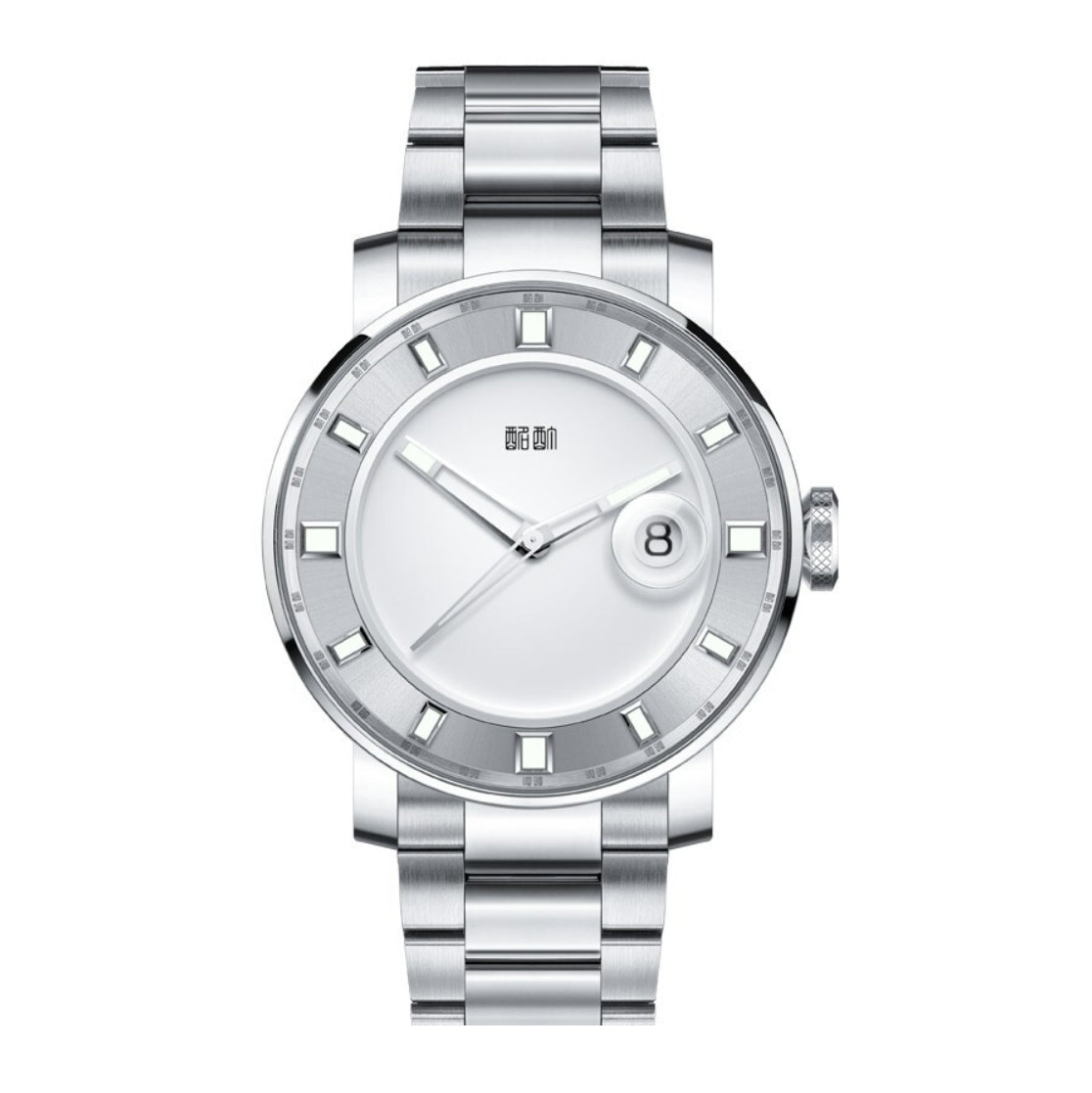 Stainless steel. Diameter: 44 mm. Thickness: 10.35 mm. Lug width: 22 mm. Water resistance: 120 meters. Luminescence: Super-LumiNova BLC1 blue luminescence on hour hand, minute hand and hour markers. Bezel: Fixed bezel, NOT rotatable. Dial: White, silver color. Applied hour markers with blue luminescence. Crystal: Sapphire crystal. Case back: Fixed with screws. Transparent. Hands: Hollow hands. Blue luminescence on hour and minute hands. Crown: Screw-down. Fluted cylinder shape. Signed with the "酩酊" logo.