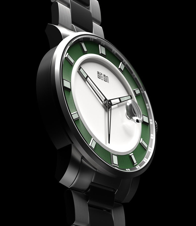 Stainless steel. Diameter: 44 mm. Thickness: 10.35 mm. Lug width: 22 mm. Water resistance: 120 meters. Luminescence: Super-LumiNova BLC1 blue luminescence on hour hand, minute hand and hour markers. Bezel: Fixed bezel, NOT rotatable. Dial: White, green. Applied hour markers with blue luminescence. Crystal: Sapphire crystal. Case back: Fixed with screws. Transparent. Hands: Hollow hands. Blue luminescence on hour and minute hands. Crown: Screw-down. Fluted cylinder shape. Signed with the "酩酊" logo.