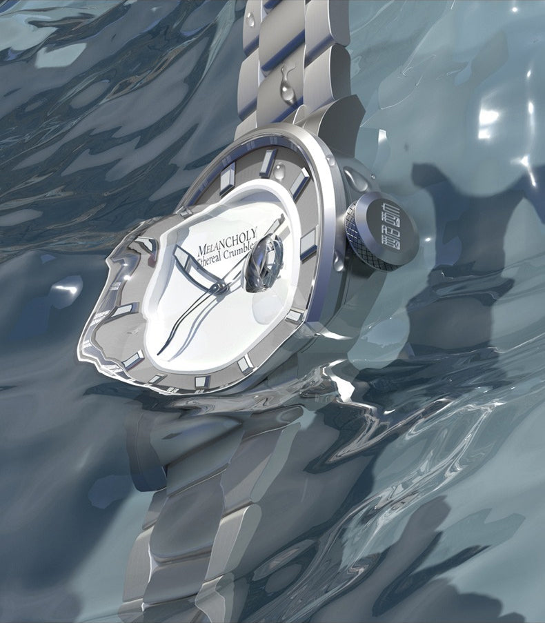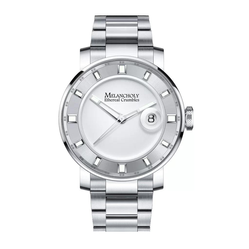 Stainless steel. Diameter: 44 mm. Thickness: 10.35 mm. Lug width: 22 mm. Water resistance: 120 meters. Luminescence: Super-LumiNova BLC1 blue luminescence on hour hand, minute hand and hour markers. Bezel: Fixed bezel, NOT rotatable. Dial: White, silver color. Applied hour markers with blue luminescence. Crystal: Sapphire crystal. Case back: Fixed with screws. Transparent. Hands: Hollow hands. Blue luminescence on hour and minute hands. Crown: Screw-down. Fluted cylinder shape. Signed with the "酩酊" logo.