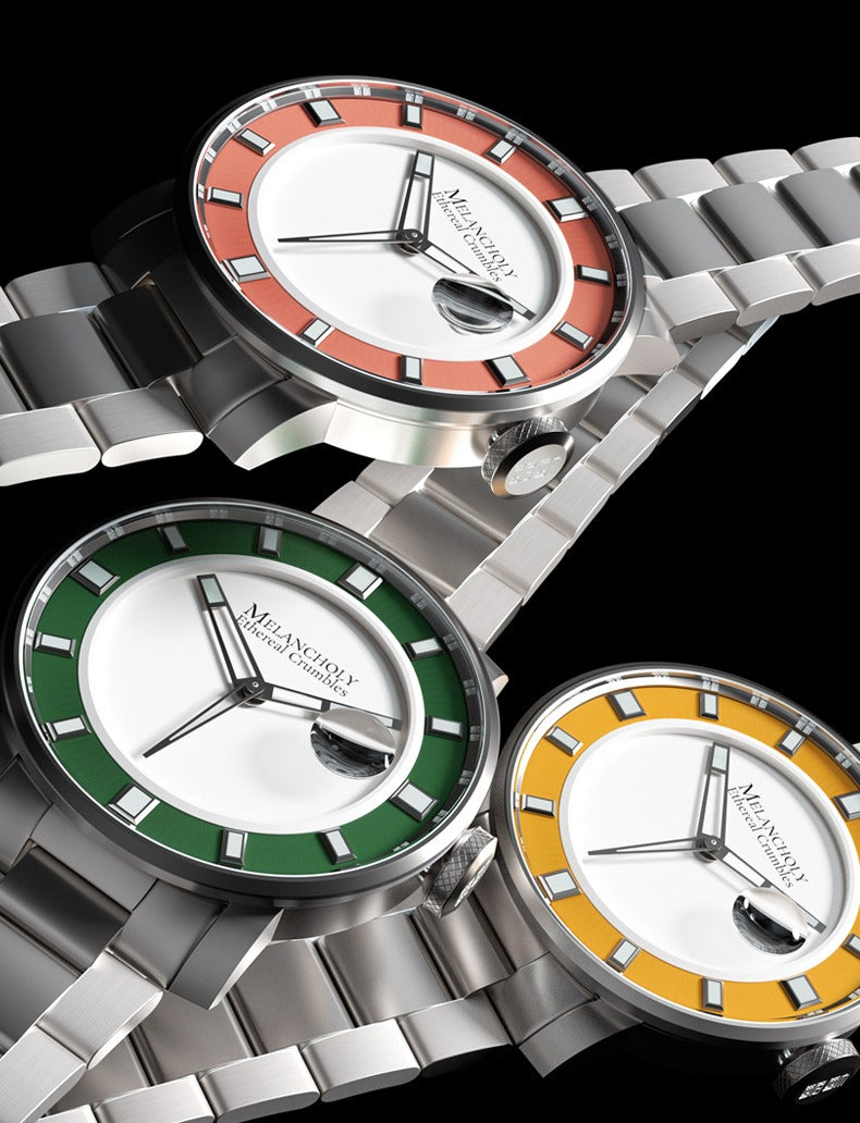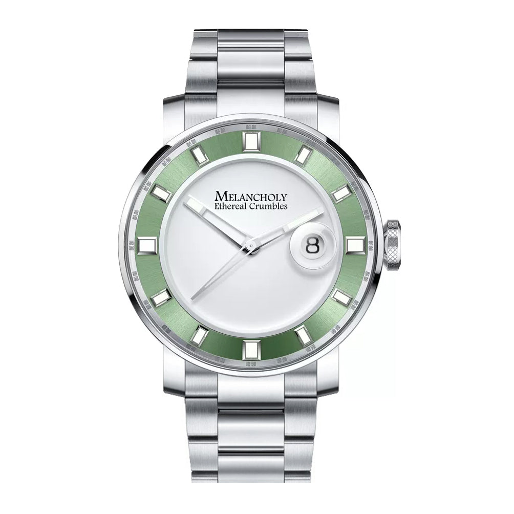 Stainless steel. Diameter: 44 mm. Thickness: 10.35 mm. Lug width: 22 mm. Water resistance: 120 meters. Luminescence: Super-LumiNova BLC1 blue luminescence on hour hand, minute hand and hour markers. Bezel: Fixed bezel, NOT rotatable. Dial: White, green. Applied hour markers with blue luminescence. Crystal: Sapphire crystal. Case back: Fixed with screws. Transparent. Hands: Hollow hands. Blue luminescence on hour and minute hands. Crown: Screw-down. Fluted cylinder shape. Signed with the "酩酊" logo.