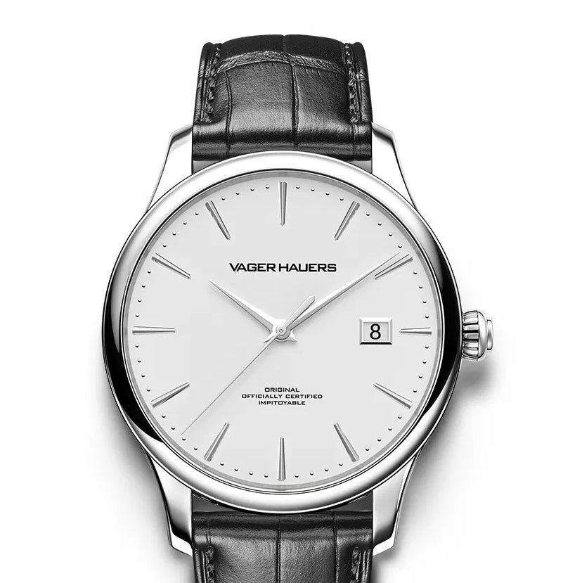 Brand: Vager Hauers (維傑豪兹). Reference: AC1008. [Version: plain white dial, leather strap, silver color case and seconds hand. View other versions→]. Launch date: 2019-Month?-Date? Autumn.