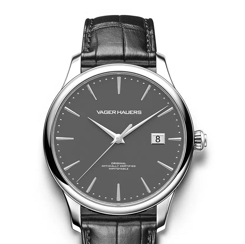 316L stainless steel. Diameter: 40.5 mm. Thickness: 9.8 mm. Lug width: 20 mm. Water resistance: 50 meters. Luminescence: No lume. Dial: Grey. Applied hour markers. Crystal: Sapphire crystal. Double domed. Case back: Fixed with screws. Transparent. Sapphire crystal case back. Crown: Push-pull. Signed with the Vager Hauers watch graphic logo.