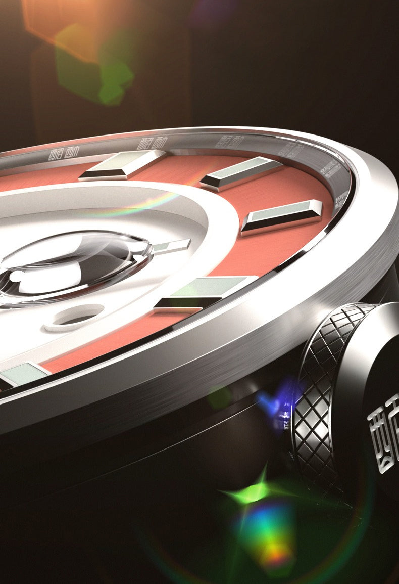 Stainless steel. Diameter: 44 mm. Thickness: 10.35 mm. Lug width: 22 mm. Water resistance: 120 meters. Luminescence: Super-LumiNova BLC1 blue luminescence on hour hand, minute hand and hour markers. Bezel: Fixed bezel, NOT rotatable. Dial: White, red. Applied hour markers with blue luminescence. Crystal: Sapphire crystal. Case back: Fixed with screws. Transparent. Hands: Hollow hands. Blue luminescence on hour and minute hands. Crown: Screw-down. Fluted cylinder shape. Signed with the "酩酊" logo.