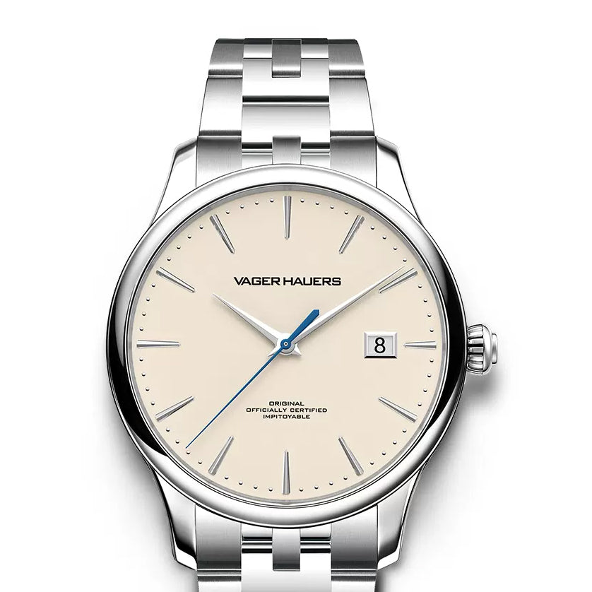 Brand: Vager Hauers (維傑豪兹). Reference: AC1008. [Version: ivory white dial, steel bracelet, silver color case, blue seconds hand. View other versions→]. Launch date: 2019-Month?-Date? Autumn.