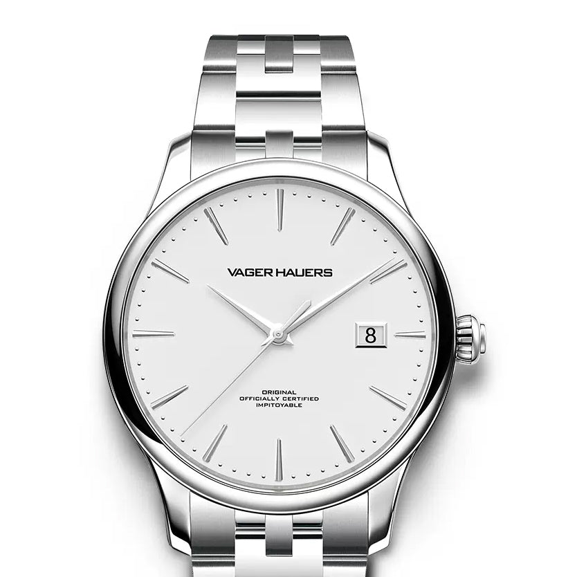 Brand: Vager Hauers (維傑豪兹). Reference: AC1008. [Version: plain white dial, steel bracelet, silver color case and seconds hand. View other versions→]. Launch date: 2019-Month?-Date? Autumn.