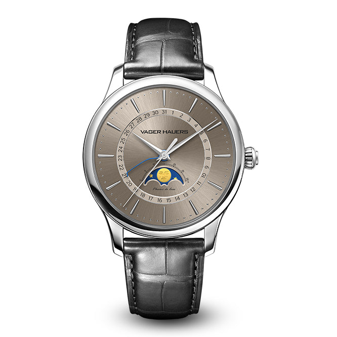 316L stainless steel. 4 parts. Polished finish. Diameter: 40.5 mm. Thickness: 12.5 mm. Lug width: 20 mm. Water resistance: 50 meters. Luminescence: No lume. Dial: Applied hour markers. Crystal: Sapphire crystal. Double domed. Case back: Fixed with screws. Transparent. Sapphire crystal case back. Hands: Dauphine hour and minute hands. Central thermal-bluing date hand. Crown: Push-pull. Signed with the Vager Hauers watch graphic logo.