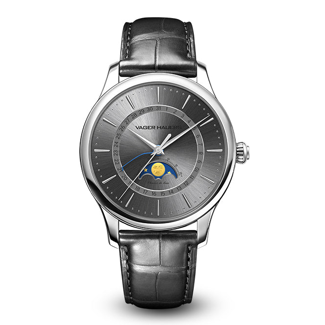 316L stainless steel. 4 parts. Polished finish. Diameter: 40.5 mm. Thickness: 12.5 mm. Lug width: 20 mm. Water resistance: 50 meters. Luminescence: No lume. Dial: Applied hour markers. Crystal: Sapphire crystal. Double domed. Case back: Fixed with screws. Transparent. Sapphire crystal case back. Hands: Dauphine hour and minute hands. Central thermal-bluing date hand. Crown: Push-pull. Signed with the Vager Hauers watch graphic logo.