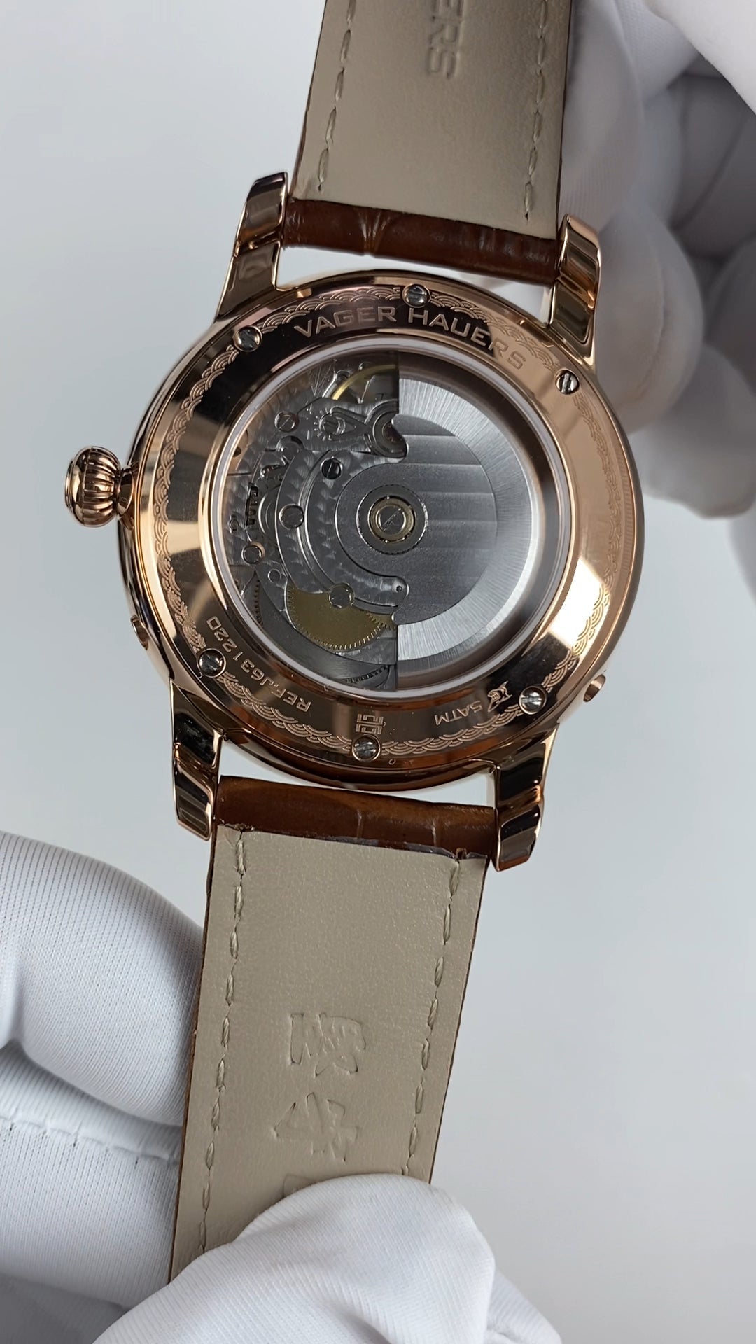 316L stainless steel. PVD coated with material containing 18K gold. 4 parts. Polished finish. Diameter: 40.5 mm. Thickness: 12.5 mm. Lug width: 20 mm. Water resistance: 50 meters. Luminescence: No lume. Dial: Applied hour markers. Crystal: Sapphire crystal. Double domed. Case back: Fixed with screws. Transparent. Sapphire crystal case back. Hands: Dauphine hour and minute hands. Central thermal-bluing date hand. Crown: Push-pull. Signed with the Vager Hauers watch graphic logo.