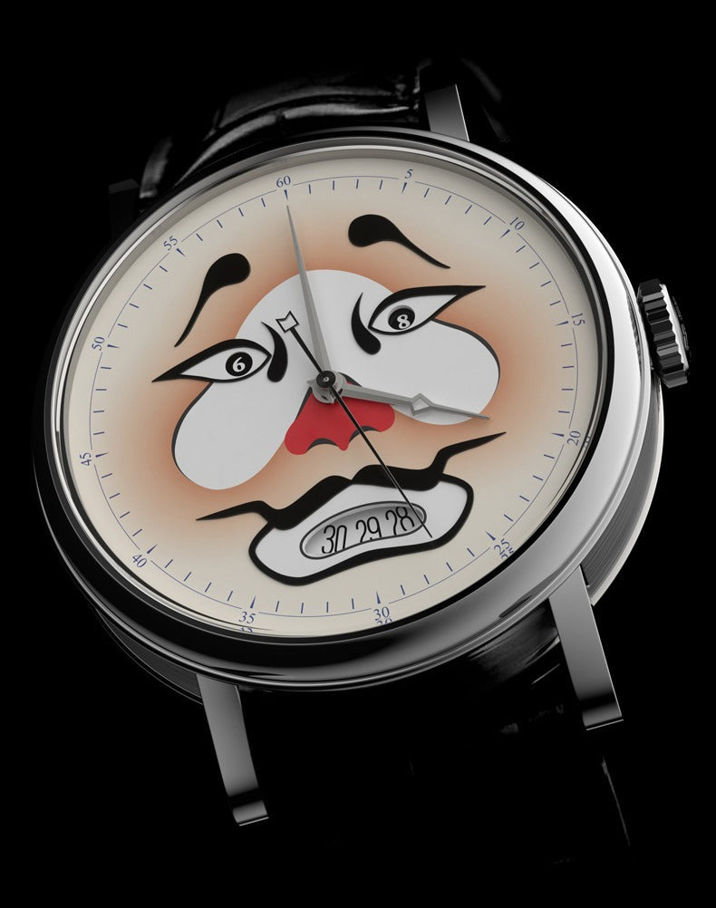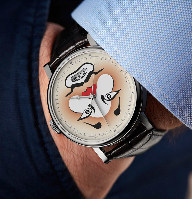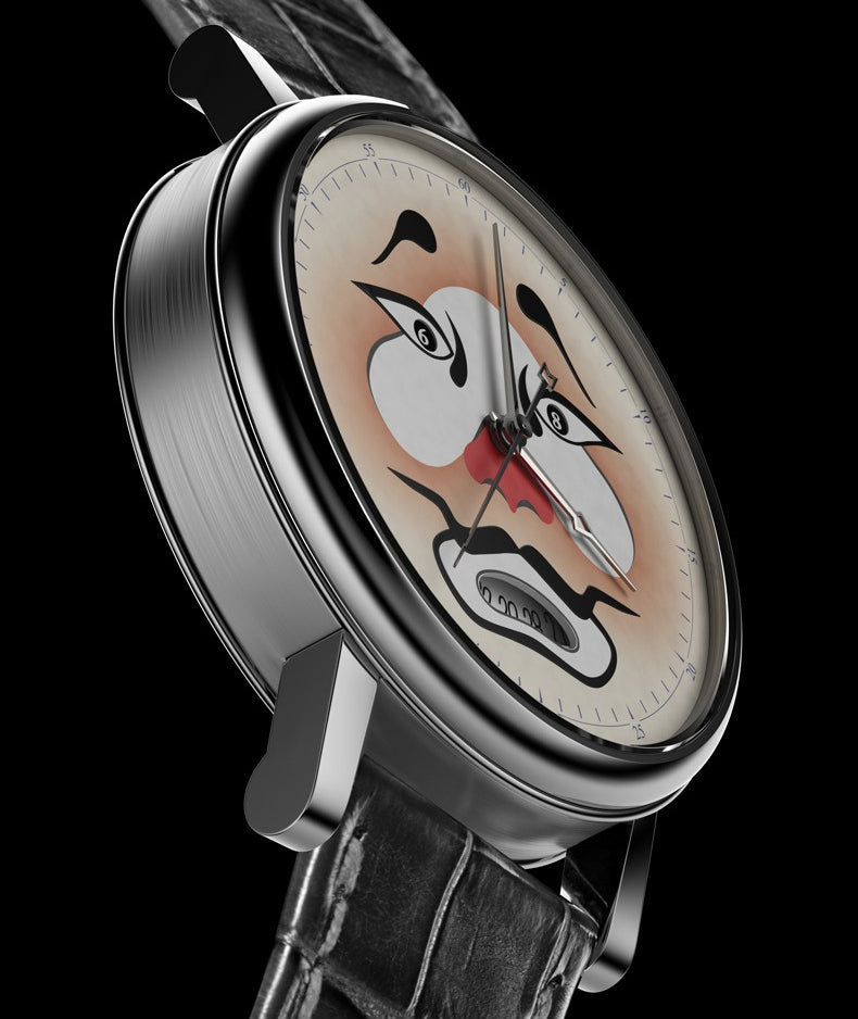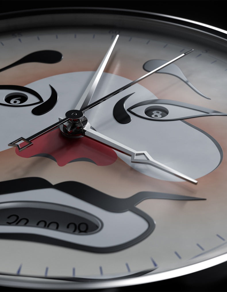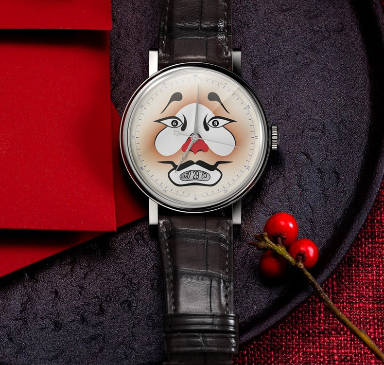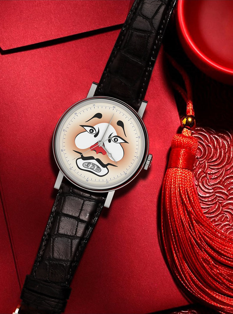 Vager Hauers 200 pieces limited release in 2020, marking 4th year of the brand. Design of the watch dial inspired by the Chou role in Beijing Opera. The "mouth" window displays date of the month (center digit). The "eye" aperture at 2 o'clock inidcates the month. The "eye" aperture at 10 o'clock shows day of the week.