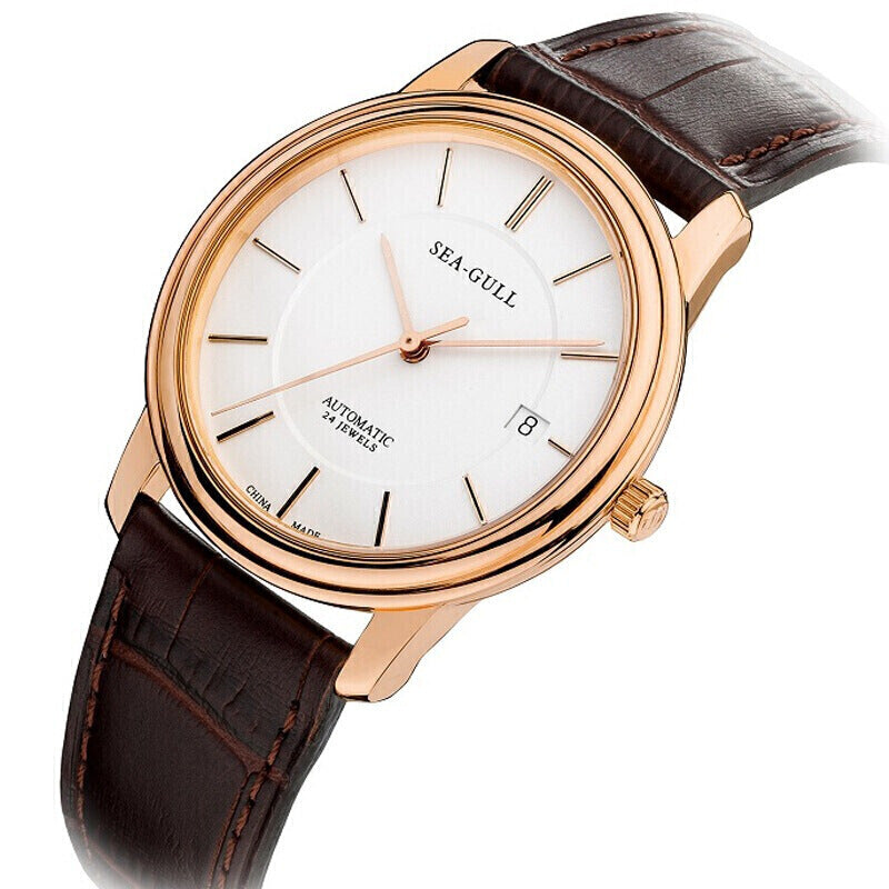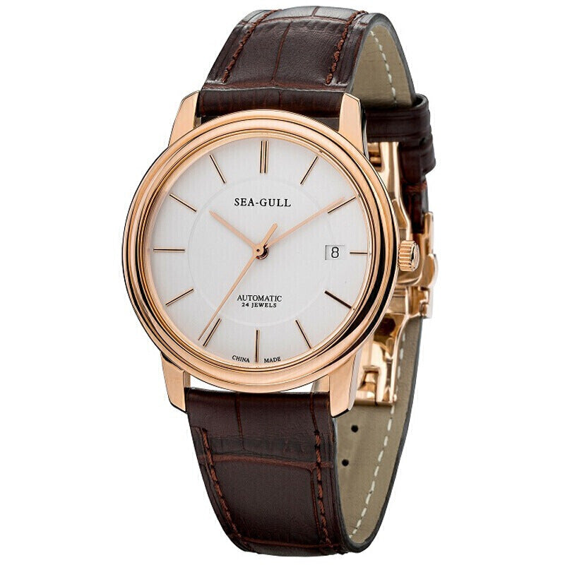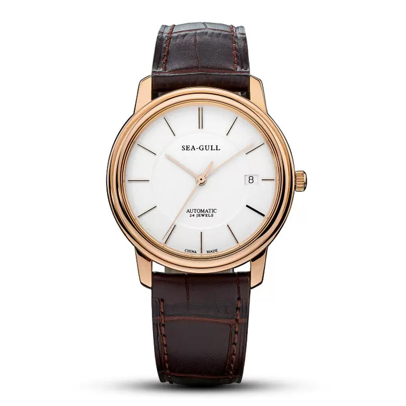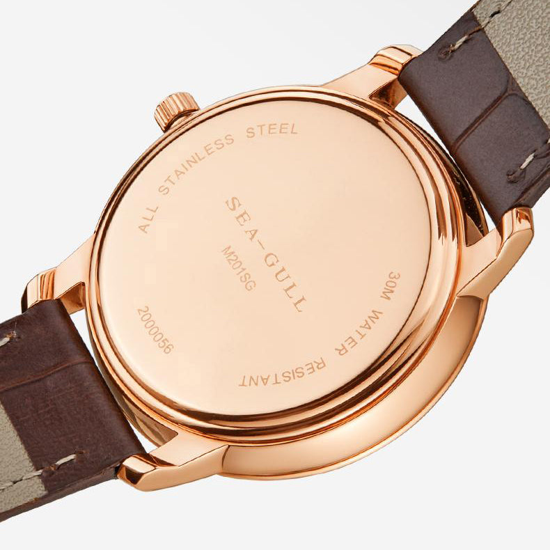 Brand: Sea-Gull (海鷗). Reference: M201SG. [Version: bigger case for men, rose gold color case, brown leather strap, English characters on dial only, no Chinese characters. View other versions→].