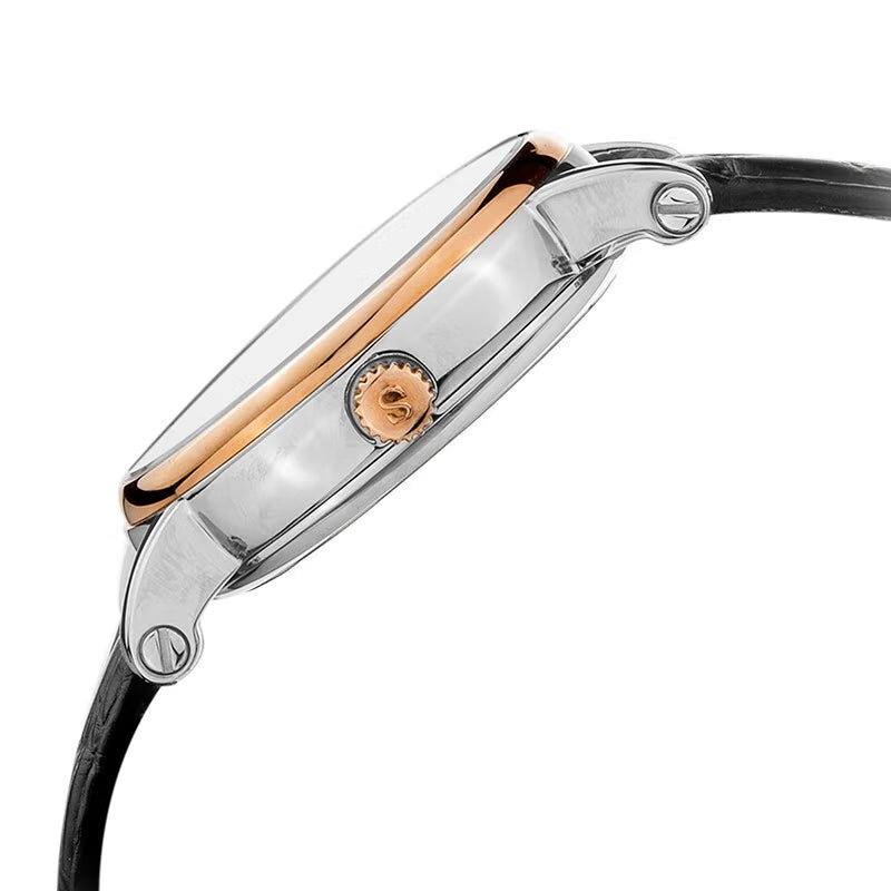 316L stainless steel. 18K rose gold bezel and crown Diameter: 30.5 mm. Thickness: 9 mm. Lug width: 18 mm. Water resistance: 30 meters. Weight: 38 grams (the whole watch including strap). Luminescence: No lume. Bezel: 18K rose gold bezel material. Dial: White. Crystal: Sapphire crystal. Case back: Not transparent. Stainless steel case back. Crown: Push-pull. Signed with the "S" logo.