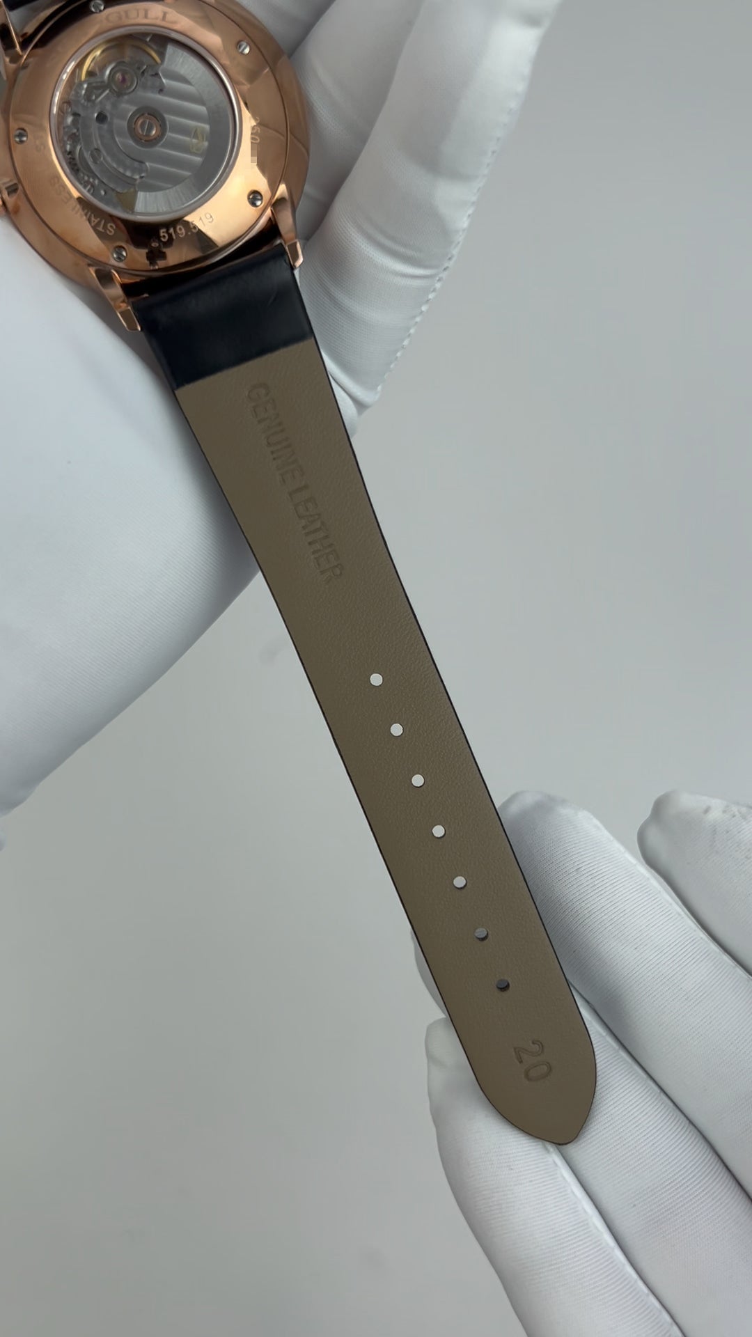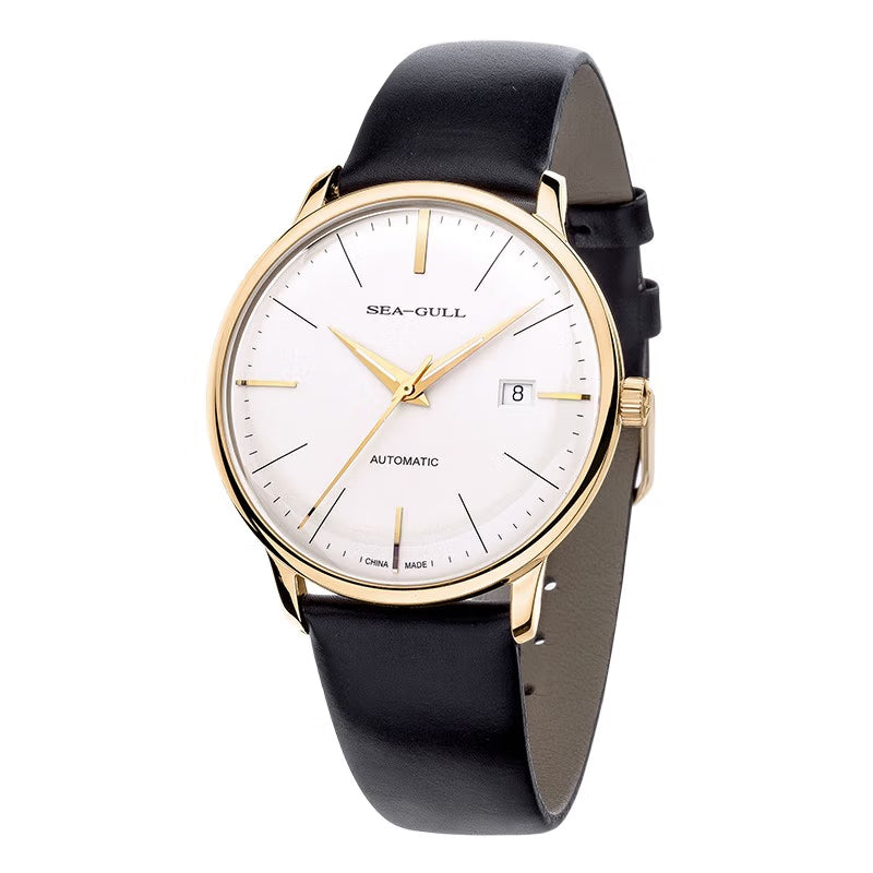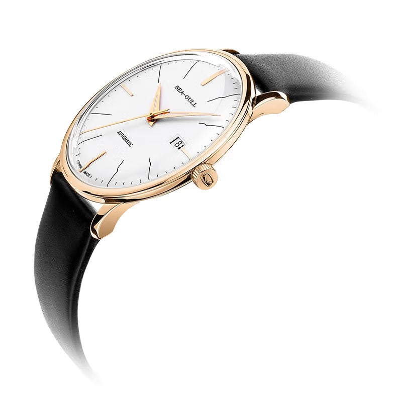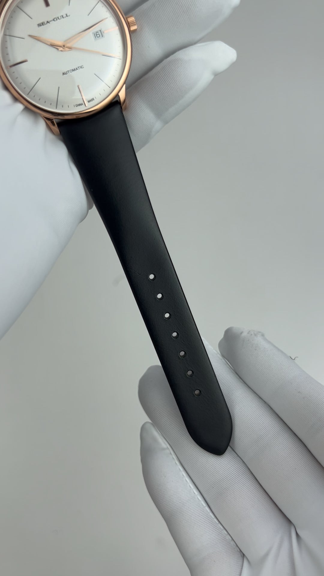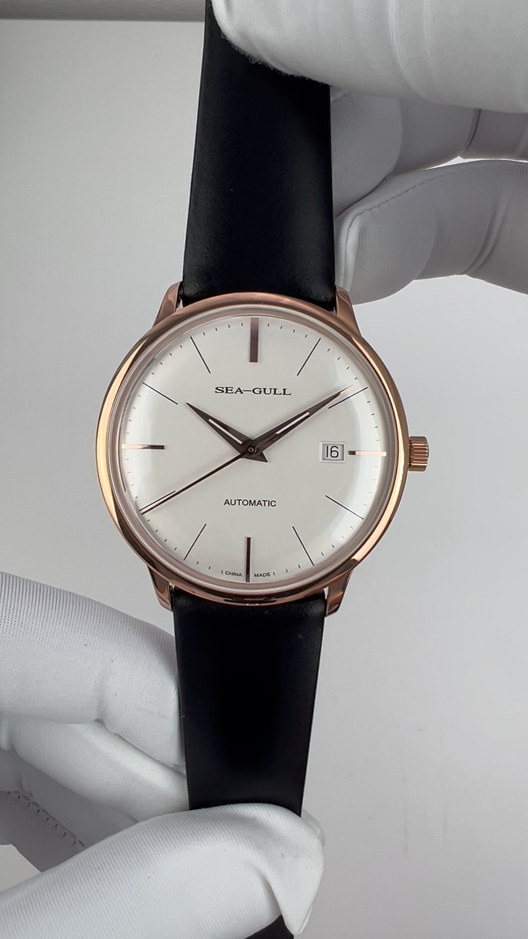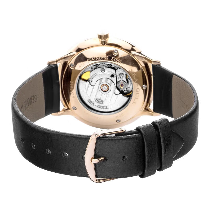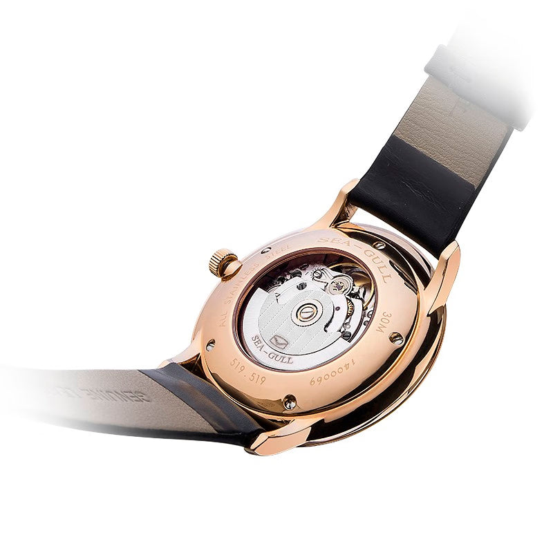 Brand: Sea-Gull (海鷗). Reference: 519.519. [Version: 316L stainless steel plated in rose gold color; Black leather strap. View other versions →].